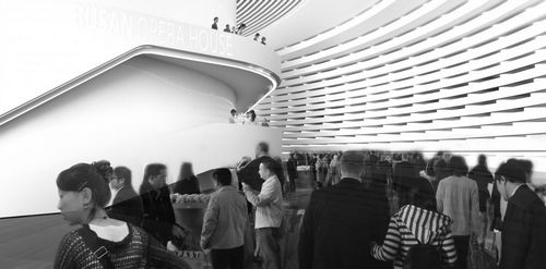 釜山歌劇院的概念性設(shè)計(jì),解決了如何在同一個(gè)表演方案里設(shè)置多種表演設(shè)施。其中一種方法是共享公共空間,如門廳和影院本身其他的共享功能空間。不同于有固定表演舞臺(tái)和公共空間的歌劇院,這種設(shè)計(jì)方式使用更有效的歌劇院方式為觀眾提供了各種體驗(yàn)。