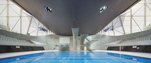 由扎哈·哈迪德 設(shè)計的2012年倫敦夏季奧運會“倫敦水上運動中心”的建設(shè)已經(jīng)完成。運動中心可以同時容納17500個人,這里將舉辦游泳,跳水,花樣游泳和水球賽事。建筑屋頂是鋁包鋼結(jié)構(gòu),橫跨160米,最寬處90米。三個實質(zhì)性的混凝土柱可以毫不費力的支撐3000噸的連綿高架結(jié)構(gòu)。雙曲拋物面結(jié)構(gòu)視覺效果類似起伏波的形式。室內(nèi)有850000瓷磚表面池和更衣設(shè)施。集群混凝土塔,包括3米的跳板和潛水平臺。