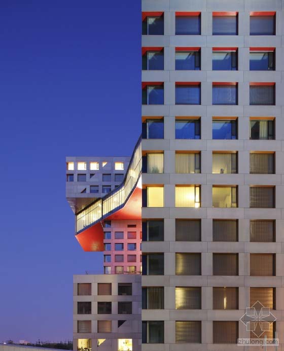 設(shè)計理念中的“多孔性”在公寓里得以全面體現(xiàn),它看起來如同城市里的一個垂直薄切片,海綿的概念經(jīng)由一系列程序和生物技術(shù)上的操作轉(zhuǎn)換成建筑物。公寓設(shè)計了五大的開間作為主要入口,視野走朗和戶外的活動場地。開間是寬闊,動態(tài)的,如同建筑物的肺一樣,在引進自然光的同時又促進了室內(nèi)空氣的流動。夜晚,每個宿舍窗戶里透出了充滿旋律感的魔幻色調(diào)的光線。