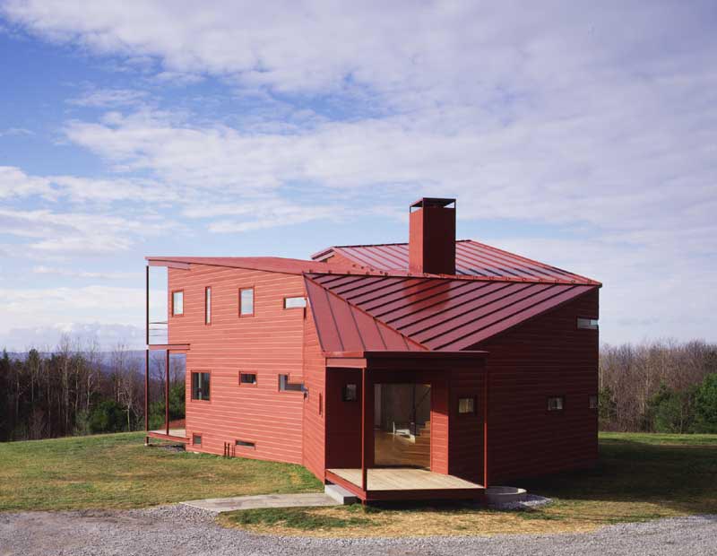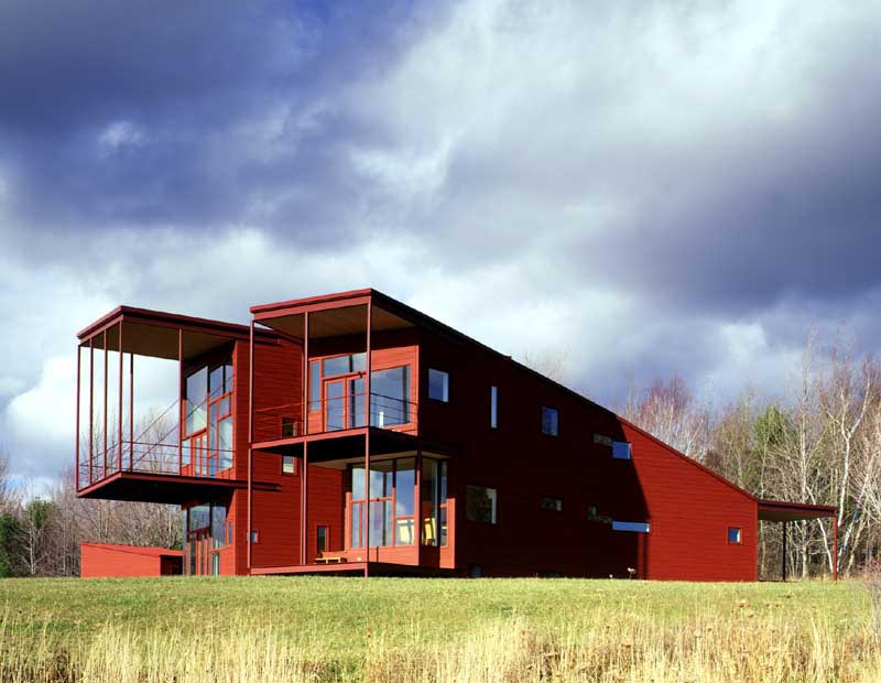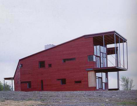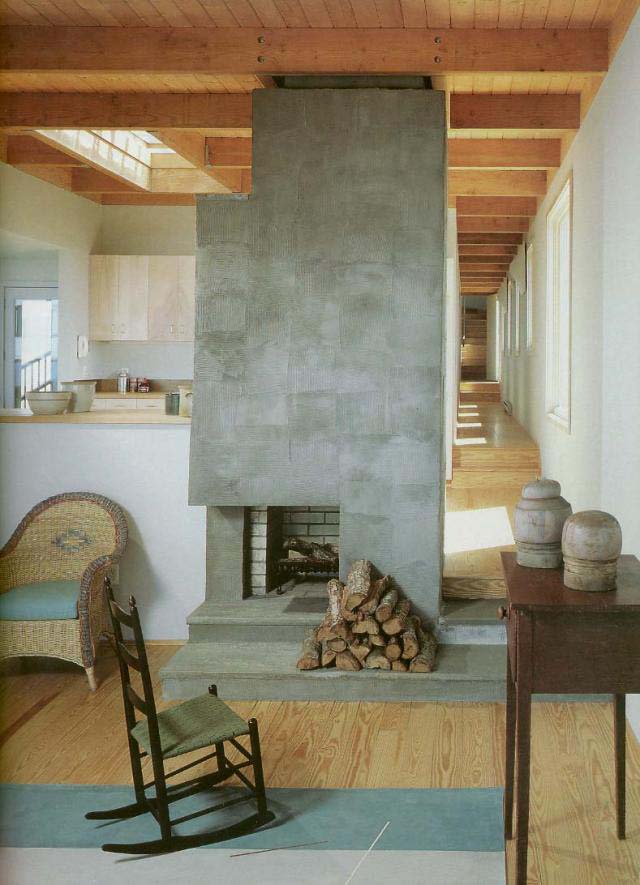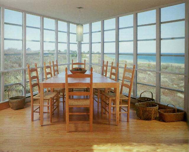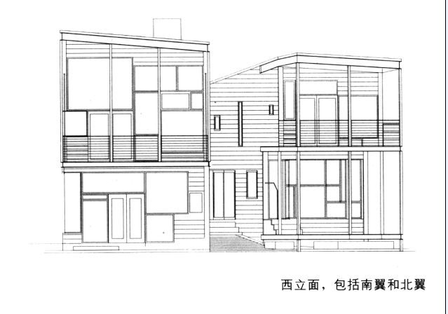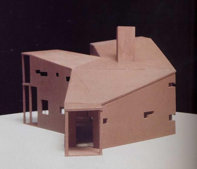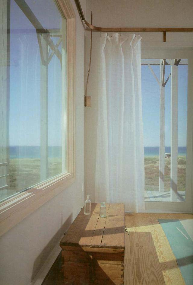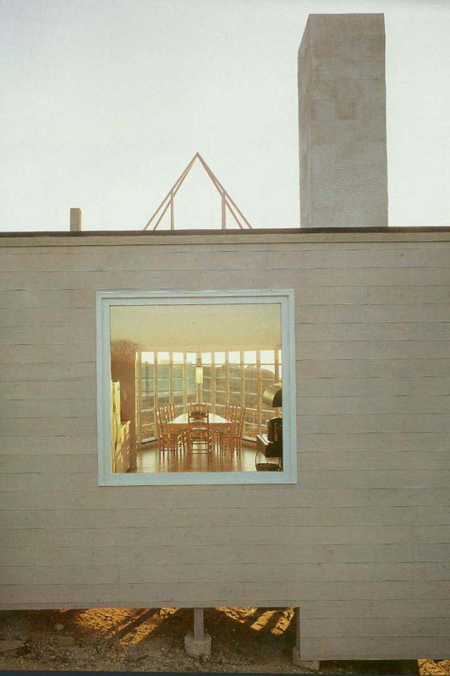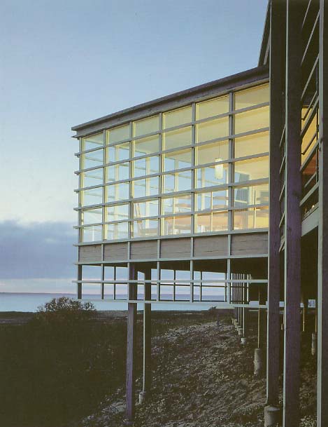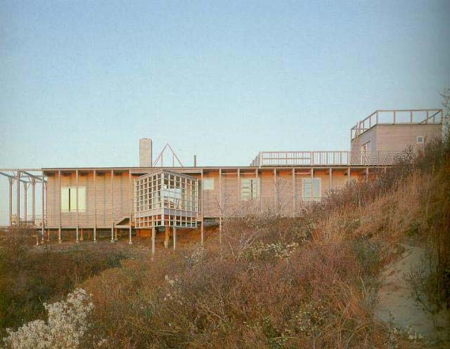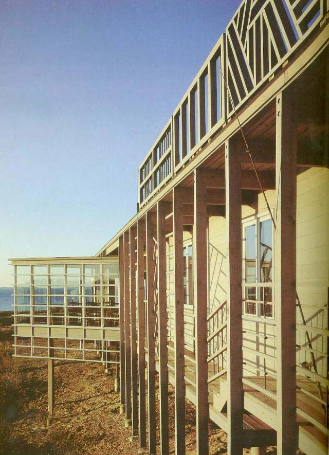霍爾在作勃·奧住宅的時候結(jié)合了美國住宅常采用的長槍式,氣球式的構(gòu)架,海灘上的沙灘景觀的營造,把住宅比擬成大海上航行的輪船。住宅本身沒有直接的航海暗示,但一層長長的平房,平房的盡頭一端豎立了2層塔樓,卻不可避免的喚起人們對輪船印象的聯(lián)想,扁平輪船的船體一端有舵手室和船橋。其他的聯(lián)想也大都起源于住宅的外表構(gòu)架,并全部統(tǒng)一于這種整體形象之內(nèi)。4×6米的構(gòu)架插身在住宅體內(nèi),形成了一種新型的原始茅屋,讓人分不清楚它式擱淺的船還是陷在沙灘上的鯨魚。