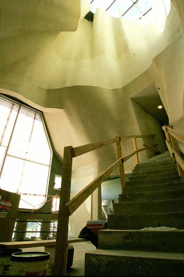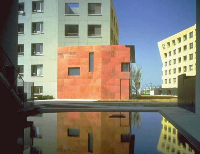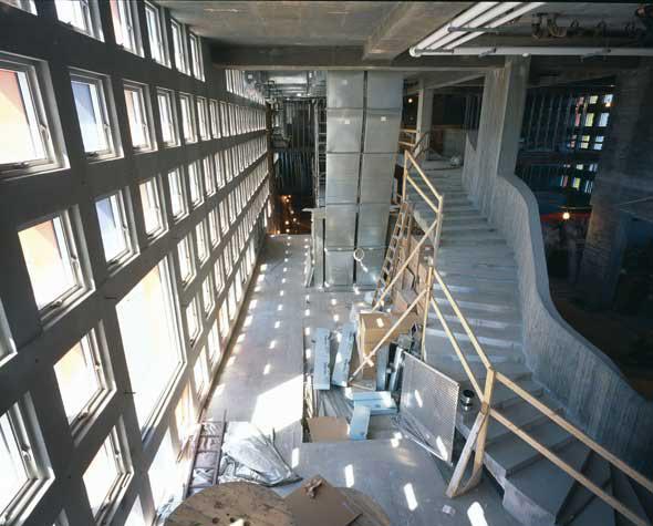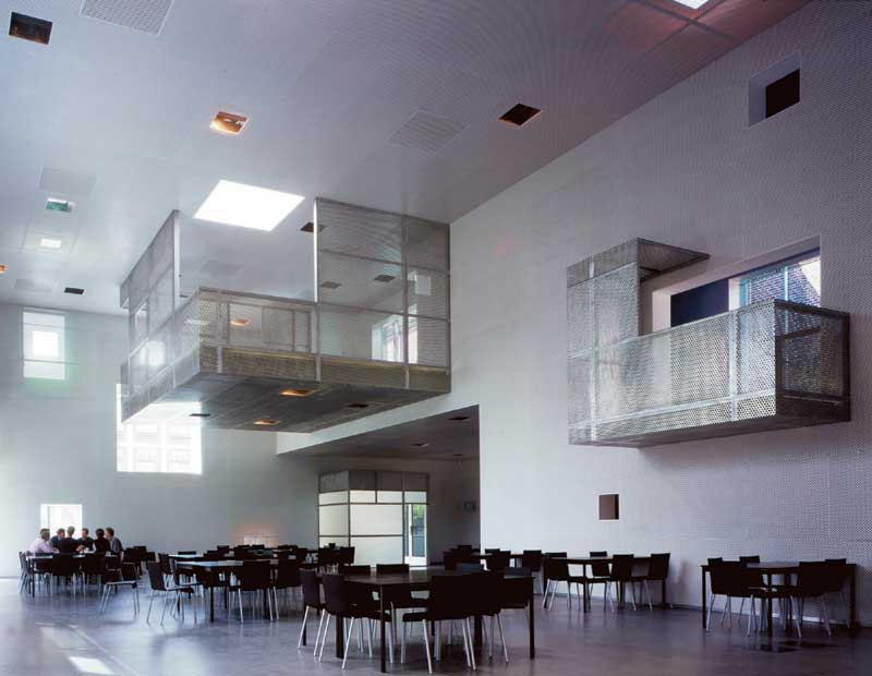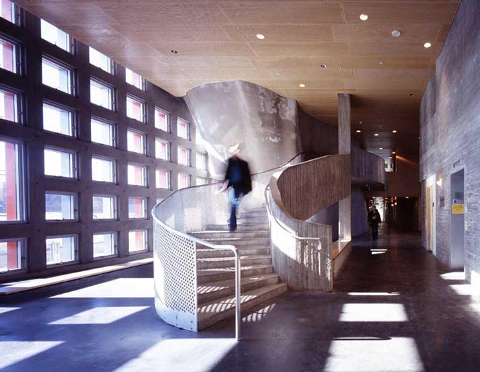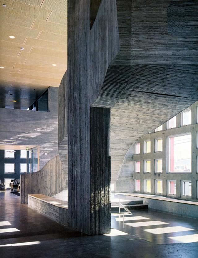 霍爾在設(shè)計麻省學(xué)生公寓時,進一步嘗試了他對感知現(xiàn)象學(xué)的見解,海綿狀的公共空間穿插在公寓中。由于結(jié)構(gòu)在外墻的解決,內(nèi)部公共空間可以十分自由,結(jié)構(gòu)墻的厚度使得洞口可以擋住夏季的陽光,在太陽高度角小的冬季,光線能夠穿過洞口進入室內(nèi)。無論是遠距離觀察或是近距離觸摸這座建筑,都可以感覺到無論是整體設(shè)想(大學(xué),社區(qū)和結(jié)構(gòu)方面)還是個體表達(室內(nèi),人和材料)都體現(xiàn)出了霍爾的現(xiàn)象學(xué)思想。