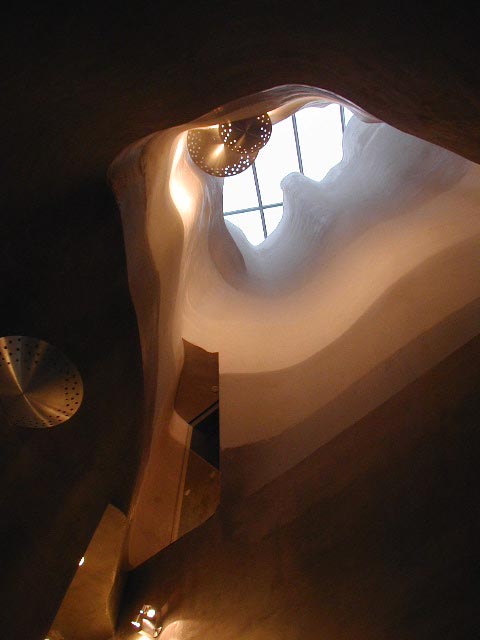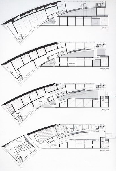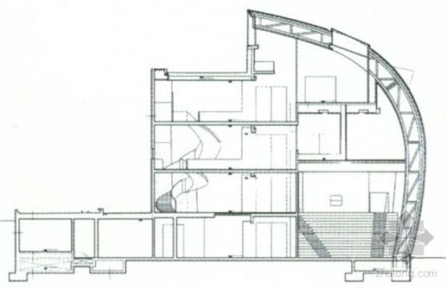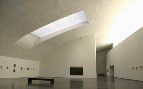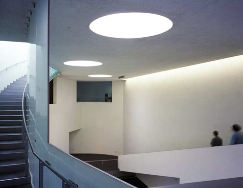 空間在形態(tài)和尺度上的些許變化來自建筑中柔和的曲線形部分,這部分的存在使水平的自然光線能以多種不同的方式進入到建筑內(nèi)部。首先,弧形墻使光線能穿透帶有半透明隔熱體的玻璃板,水平光線被偏轉(zhuǎn)后沿建筑的中心部分向下投射,到達上部和下部的所有層。其次,帶有天窗的弧形屋面為頂層下部的展室提供了另一種光的分布方式。建筑的曲線構(gòu)成和交錯的形態(tài)特點以及空間與光線的交織扭轉(zhuǎn)使得25個展室均能獲得自然采光。