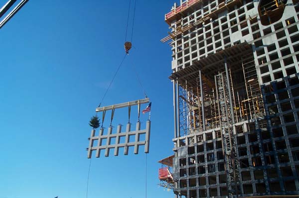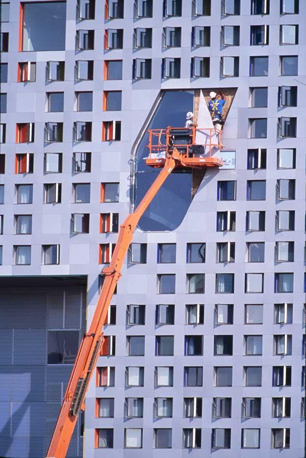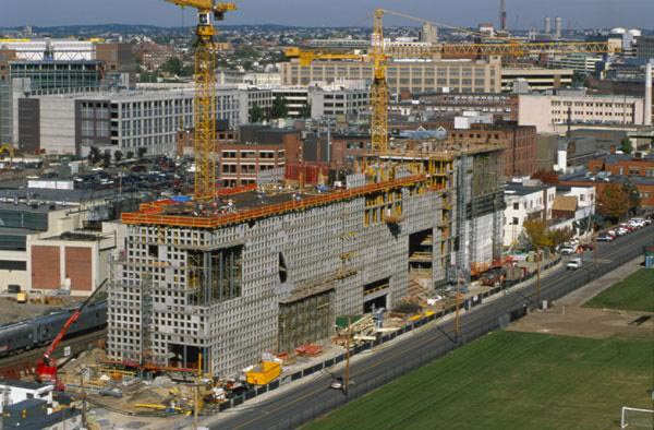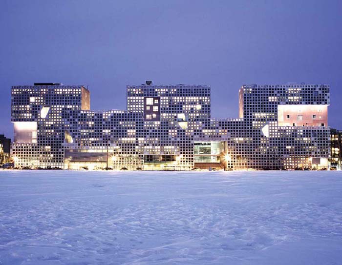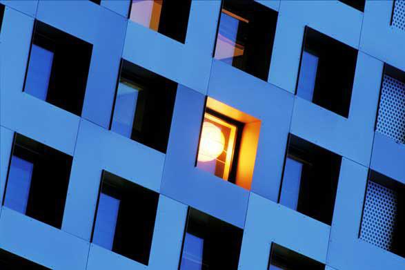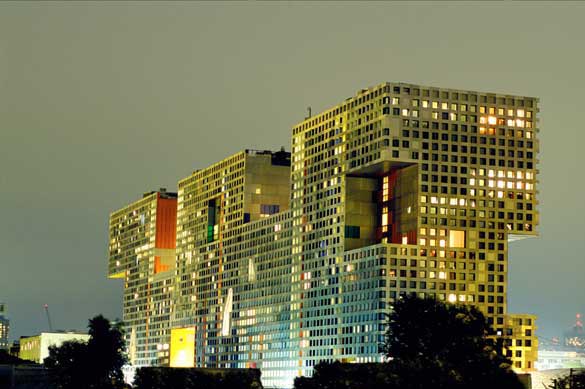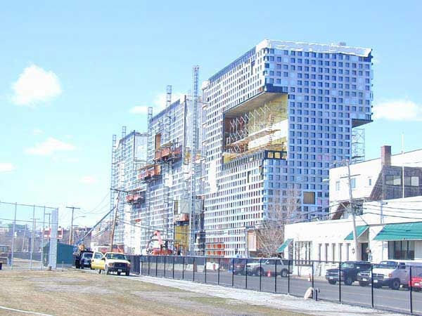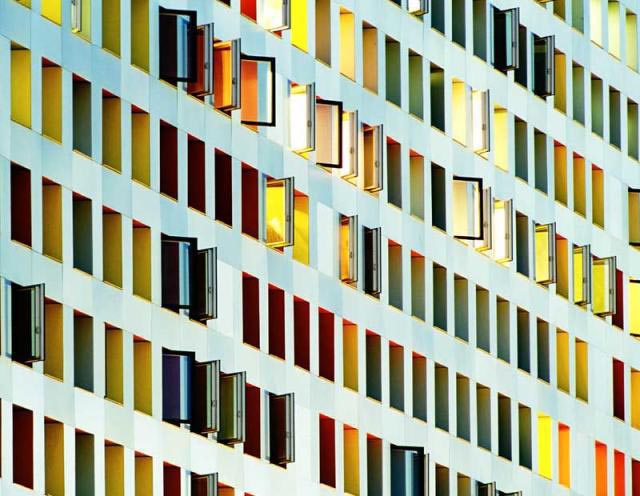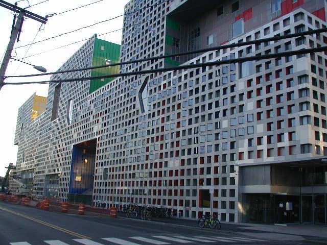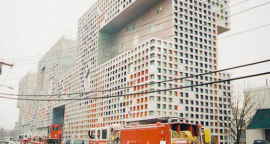 simmons公寓建筑共10層,長382米,設(shè)有一所電影院,宵夜咖啡廳和室外餐廳,外表如同一個被切成互相聯(lián)系的三個塔拼貼了方孔材質(zhì)巨大的混凝土網(wǎng)絡(luò)?;笮?2英尺*384英尺。部分體量被掏空形成懸挑區(qū)域,在底部有面向麻薩諸塞州大街的入口,一個由露天座椅劃分出來的平臺以及一些露天參作。這棟建筑處于貝克樓的背后,整體上看象是一個巨大的相互連接體,給人以多種不同的空間享受。18英尺進身的網(wǎng)絡(luò)保證了2平方英尺的窗戶遮陽,同時考慮到依靠冬日的陽光角度低的特點給建筑供暖。有些方格用混凝土添實,還有一些是異性的,很多側(cè)住被刷上了顏色形成了主要的色彩圖案,當人移動到側(cè)面的時候就顯得更加明顯了。建筑看上去就好像是浮動的格柵,從銀灰色變成了彩色的,同時這也導(dǎo)致室內(nèi)的一些變化,這是一種非?,F(xiàn)代的方格式建筑,在晚上,光線從室內(nèi)透出來,建筑看上去好像式一個發(fā)光的海綿體。