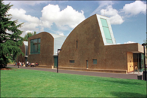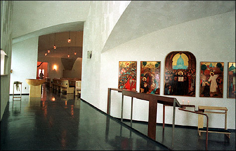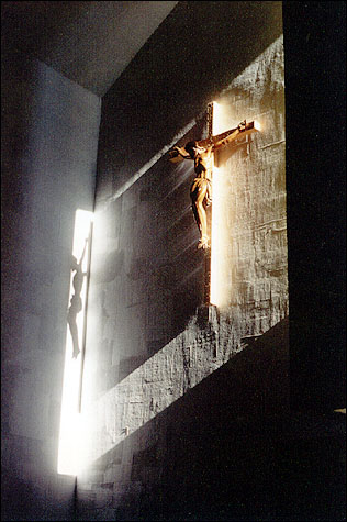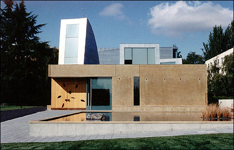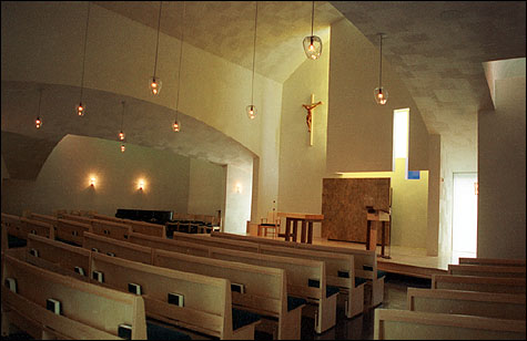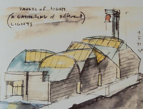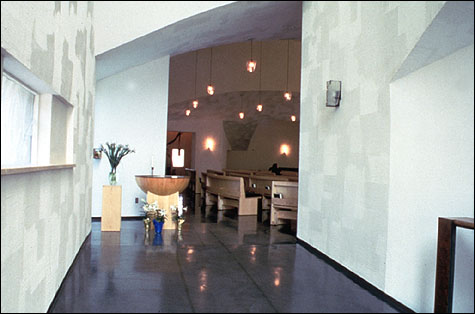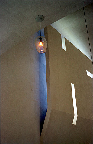 它的外部是一個素素的混凝土房子,式樣極為普通,但是一進入室內,所有的光都呈現(xiàn)出斑斕的色彩,直接,間接,反射,磨砂,不斷游戲般轉換著,一切都近乎完美地體現(xiàn)了霍爾的最初的構想:“在一個石盒子上放置一個空瓶子”。在功能特定的空間區(qū)域里,每個瓶子以各自的角度,形式與色彩提供兩種光源效果,以是直接穿過瓶子照射在地上與墻上的光,另一是涂滿色彩的墻面,光照后反射出暈般迷離的影子,與精心設計的一套人工光源晝夜交替,為我們呈現(xiàn)出空間中光的戲劇性力量。