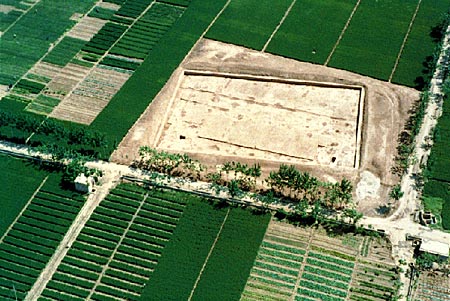 商代諸王亦多次遷都,已知者有西亳、傲、相、耿、邢、奄、殷等?,F(xiàn)經(jīng)發(fā)掘者有河南洛陽偃師縣尸鄉(xiāng)溝商城,該城北依邙山,南臨洛水,建在洛水北岸稍稍隆起的高地上。其平面大體呈南北長之矩形,面積約190萬平方米。南垣已為洛河沖毀,城內(nèi)探出有城門七處。門道兩側(cè)遺有木柱洞,道下溝底鋪鱗狀石片,系城之排水溝。城內(nèi)南端有周以圍墻的集中夯土臺,估計為宮室所在。再據(jù)文獻《尚書·序》說“湯始居亳”、《帝王世紀》說“蒙為北亳”、“谷熟為南亳”、“偃師為西亳”及地望,此城很可能是一世成湯所居的西亳。晚商時盤庚遷都于殷(今河南安陽西北)。該遺址東西廣6公里,南北長4公里,迄今尚未發(fā)現(xiàn)城墻。其宮殿位于洹水河曲之南岸,環(huán)以手工業(yè)區(qū)及民居。王室、貴族的墓葬則集中于洹水之北岸。