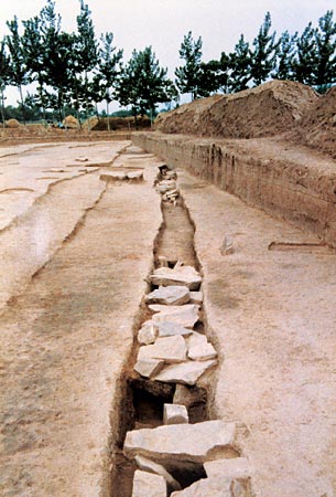 二里頭商城遺址內(nèi)底部鋪墊了石塊的排水溝