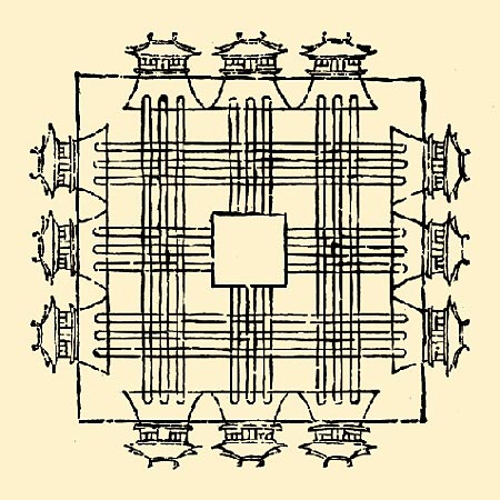 關(guān)于周代都城的確切情況,目前尚難了解。據(jù)《周禮·考工記》所載之周王城:“匠人營國,方九里,旁三門。國中九經(jīng)九緯,經(jīng)涂九軌。左祖右社,面朝背市?!北砻髟摮瞧矫嫦祵ΨQ布局之正方形,由通過城門可容九車并行的縱橫道路,將王城劃為相等的九區(qū)。宮殿居中,宮前左置祖廟,右建社稷。周王面南臨朝而背北為市肆。上述布局反映了“王者居中”、“為數(shù)崇九”等王權(quán)思想和嚴謹對稱的規(guī)劃原則,對后世封建王朝帝都建設(shè)的影響極大。