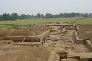 夏、商、周三代的城邑據(jù)文獻記載,夏代統(tǒng)治的四百年間,都城曾多次遷徙,如陽城、陽翟、斟、帝丘、原、老丘、西河……等,但是這些遺址現(xiàn)均無從追索。公元1975年在河南登封告成鎮(zhèn)王城崗,發(fā)現(xiàn)毗連方形小城(每邊長度約100米)二座,其大部夯土城墻尚可辨析。在城內(nèi)夯土殘基中,有數(shù)處埋葬二至七人之奠基坑,還出土了陶器及少量銅器碎片。經(jīng)碳14檢測,此城建造時間距今4000±65年,相當夏代早期。有學者認為此遺址即夏代始帝禹的都邑——陽城。公元1979年在河南淮陽平糧臺,亦發(fā)現(xiàn)相當于夏初(測定為4130±100年)之古城。該城平面方形,每邊長185米,方位北偏東六度。夯土城墻殘高3.5米,基寬13米。城內(nèi)有房基十余處,部分建于土臺之上,部分建于平地。屋墻已普遍使用土坯磚,磚的形狀有長方形、方形及三角形多種,墻外表有的涂抹草泥。城內(nèi)又發(fā)現(xiàn)由輪制之陶水管多節(jié)及冶煉后之銅渣。