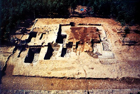 河南洛陽二里頭發(fā)現(xiàn)的夏代早期宮室遺址,系由數(shù)組周以回廊的庭院組成。其主要殿堂置于廣庭中部,下承夯土臺基。臺基平整,高出當時地面約0.8米,邊緣呈緩坡狀,斜面上有堅硬的石灰石或路土面。而殿堂位于臺基中部偏北,東西長30.4米,南北深11.4米,以卵石加固基址。建筑結(jié)構(gòu)為木柱梁式,南北兩面各有柱洞九個,東西兩面各有柱洞四個,但柱網(wǎng)尚不甚整齊。壁體為木骨抹泥墻,屋面則覆以樹枝茅草。以上做法均符合文史中夏代建筑采用“茅茨土階”的記載。值得注意的是,主體建筑面闊為等跨的八開間,回廊已出現(xiàn)復廊形式。前者表明偶數(shù)開間的使用包涵著某種宗法禮制的內(nèi)容,而后者表明這種復合形式的淵源定將更為久遠。