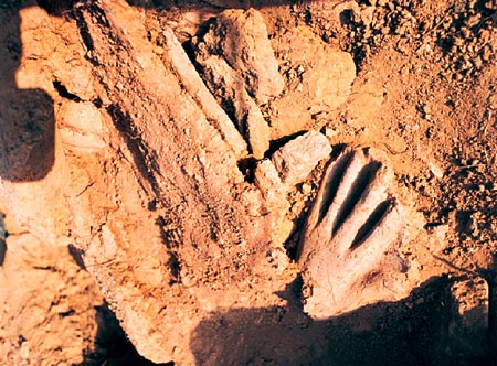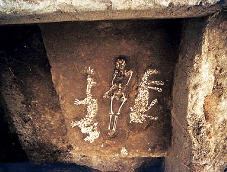 河南濮陽西水坡村仰韶文化晚期墓葬。墓主身旁有貝殼擺砌之虎形、龍形圖案