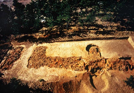 該遺址共分三層,最內(nèi)為夯筑之紅土臺,南北長約7.7米,東西寬約6米。外以灰土筑圍溝,深0.65~0.85米,寬1.7~2.1米。溝之西、北、南三面又以黃褐色土筑土臺,其寬分別為5.7米、3.1米、4米,臺面鋪礫石。其西、北再以礫石建石墻。壇上列有南、北二行墓葬共十二座。依遺物判斷,墓主可能是祭師。
