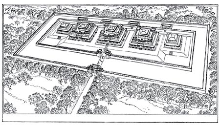 依陜西鳳翔秦故雍城宮殿遺址,有沿南北軸作對稱排列之五重庭院,其外周以宮墻,是最接近于上述“三朝五門”的建筑實例。