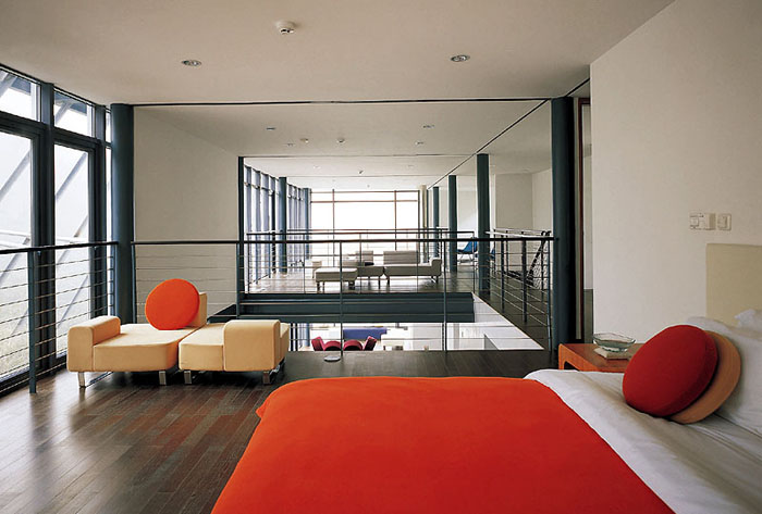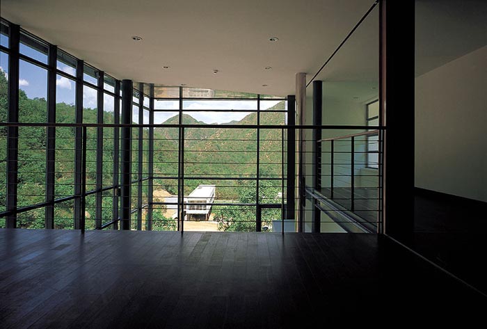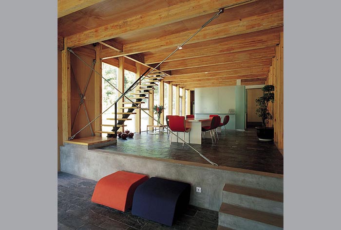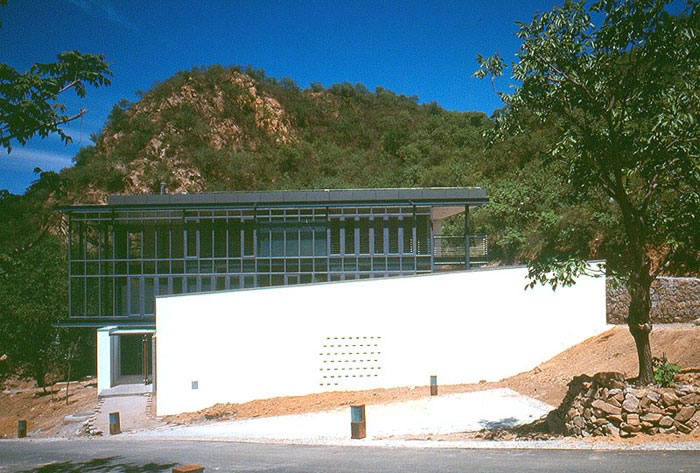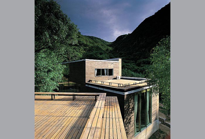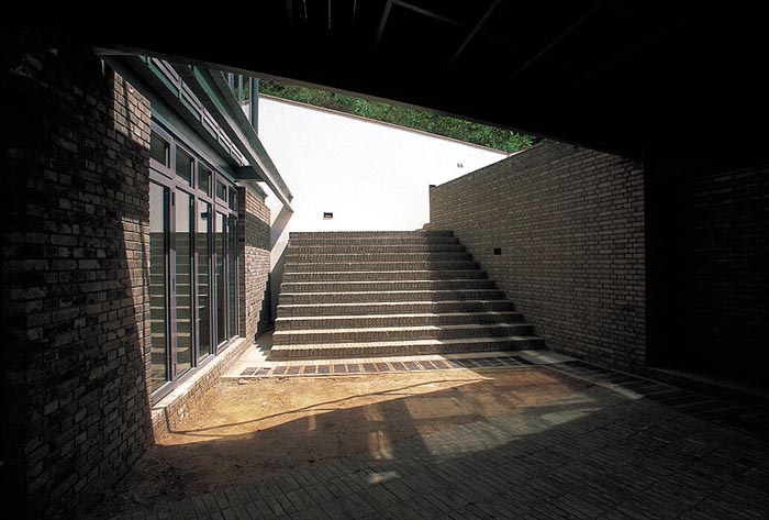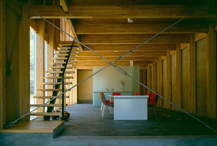 建筑的終飾則以最單純的元素,白色刷漆的墻面、木質(zhì)地板與石材鋪面?zhèn)鬟_(dá)了寧靜的鄉(xiāng)村式家居生活的感覺。遮擋外露西南向立面的竹子屏柵表現(xiàn)了空靈的氣質(zhì),與中庭散發(fā)的強(qiáng)烈互久感覺相映成趣。