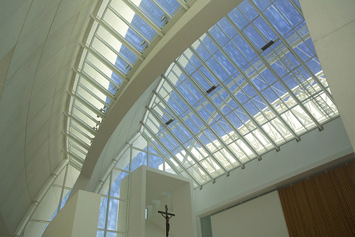 教堂所在地距離羅馬市中心6英里,附近是一片上世紀(jì)70年代修建的中低收入居民住宅樓以及一座公共花園。教堂建筑面積108414平方英尺,包括教堂和社區(qū)中心,兩者之間用4層高的中庭連接。建筑材料包括混凝土、石灰華和玻璃。三座大型的混凝土翹殼高度從56英尺逐步上升到88英尺,看上去像白色的風(fēng)帆。玻璃屋頂和天窗讓自然光線傾瀉而下。夜晚,教堂的燈光營造出一份天國的景觀。