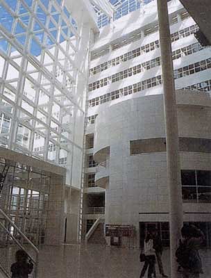 邁耶近年為洛杉磯設(shè)計(jì)的蓋蒂中心,一反他慣常使用的方方正正的構(gòu)圖手法,而大量運(yùn)用曲線形式作為組合要素,從而使這個(gè)建筑群無論在體形還是室內(nèi)、外空間上都獲得了十分豐富的變化。這一方面可能意味著他在設(shè)計(jì)理念上有新的開拓和發(fā)展,另外,也可能出于獨(dú)特地形的考慮,以使建筑物與景觀相融合。