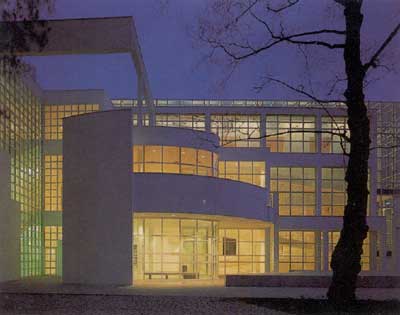 在邁耶的作品中,還可以發(fā)現(xiàn)一種常見的手法,即利用面的延伸,以求得體形上的完整。這種手法嚴(yán)格說來和現(xiàn)代建筑的理念是不相吻合的?,F(xiàn)代建筑崇尚形式服從功能,表里必須一致,反對(duì)一切與功能無關(guān)的形式要素,甚至把這些原則當(dāng)作一種教條而不容異議。這樣,便作繭自縛,從而導(dǎo)致形式上的單調(diào)。當(dāng)代某些建筑師不顧這種教條的束縛,致使外形流于凌亂。為克服這一缺陷,建筑師時(shí)而也利用一些透空的格架,以虛擬的空間來填補(bǔ)殘缺的部分,以求得體形上的完整。邁耶常用的手法則是借助于面的延伸以保持完形。如建于烏爾姆的會(huì)展建筑的一角,就其基本體形看,原來是殘缺、凌亂和不完整的,邁耶卻巧妙地運(yùn)用了面的延伸,從而確保了感觀上的 完形。另一個(gè)例子是海普盧克斯銀行,位于主體建筑西南的附屬部分,從平面形狀看是構(gòu)不成圓形界面的,但是在它外緣設(shè)置了一層筒形的墻面后,便填補(bǔ)了殘缺,使體形復(fù)歸于完整。