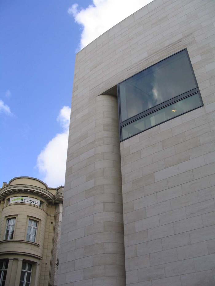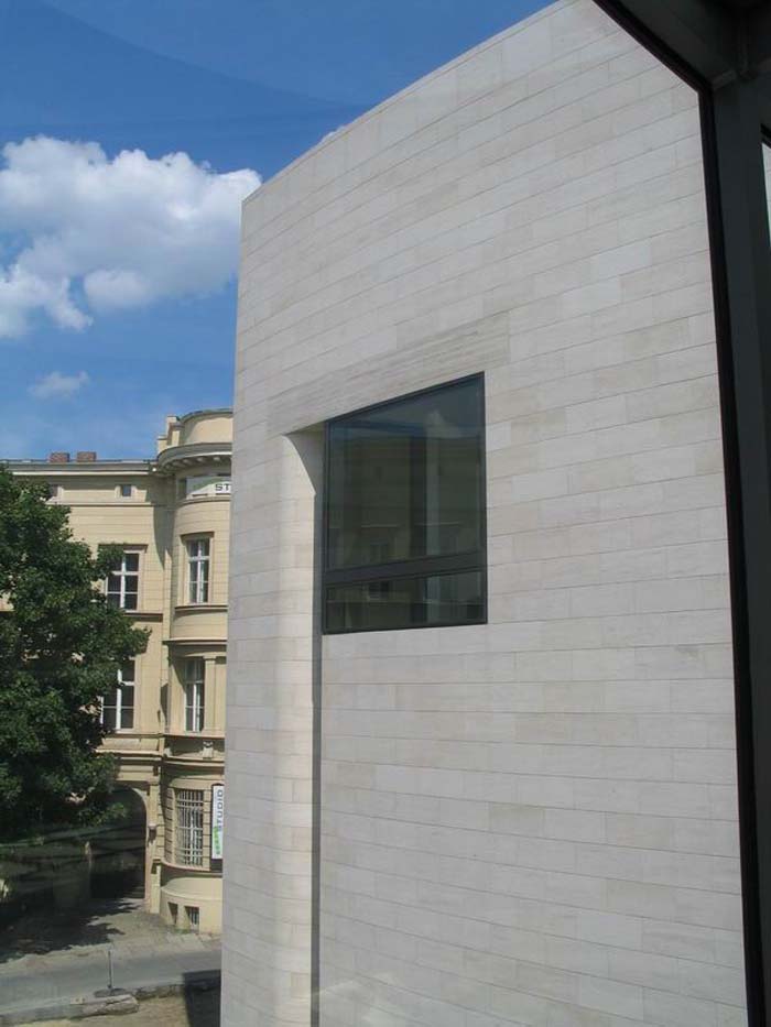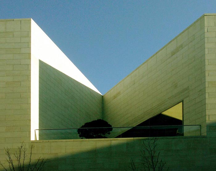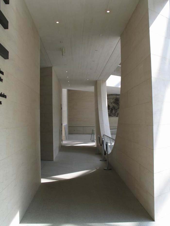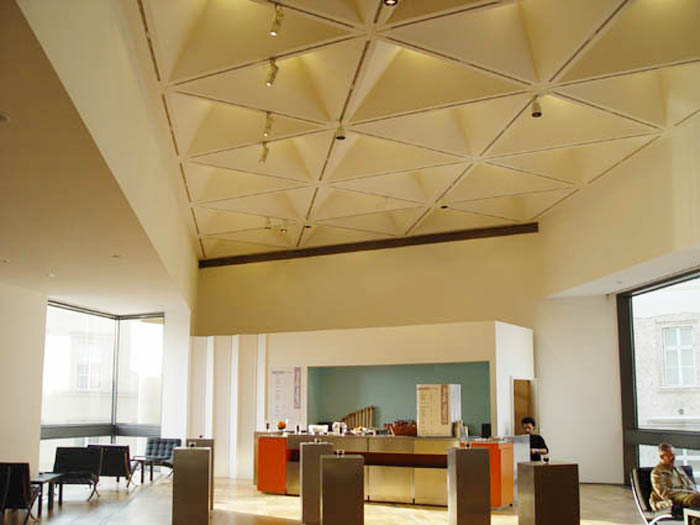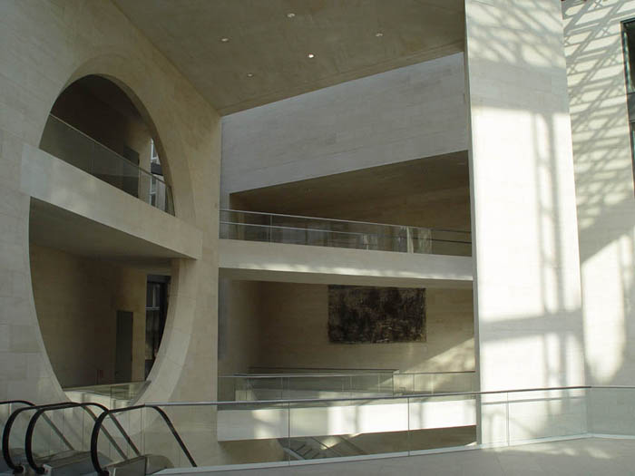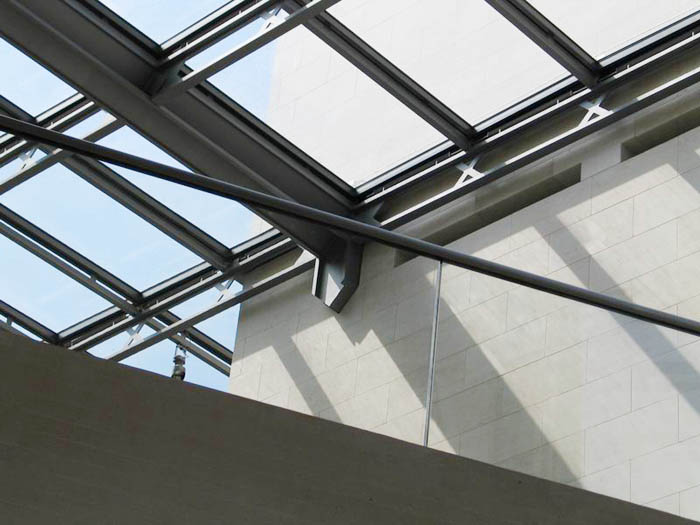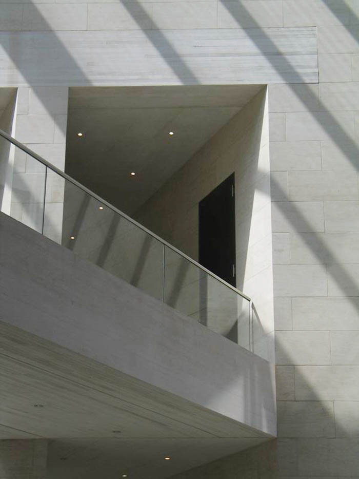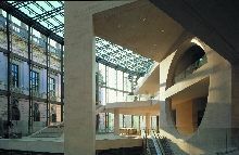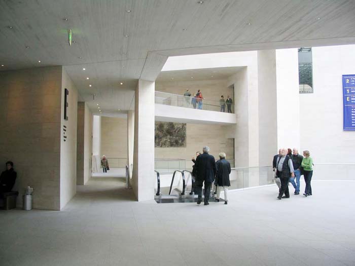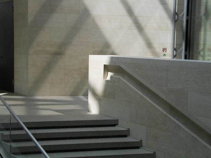 [page]各展廳設(shè)在一個以天然石料裝飾墻面,絕大部分為封閉的建筑體中。出于文物保護方面的原因,這些展廳都不開設(shè)窗戶,但各處都保持了同基本幾何體-三角體的關(guān)聯(lián)。僅只是在三樓按貝聿銘的想法在建筑體上切出了三角形的凹槽。一個屋頂平臺和一個凸出的玻璃內(nèi)陽臺實現(xiàn)了投向博物館島的視野和聚焦于新瓦赫及七葉樹林之目光的可能。在東端緊靠著博物館的管理樓是個L型的建筑。在里面設(shè)置了報告廳和藝術(shù)品修復工場。