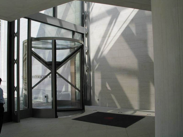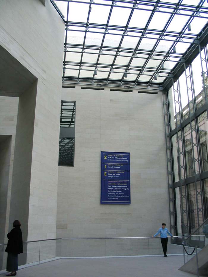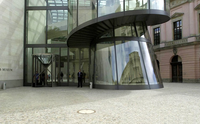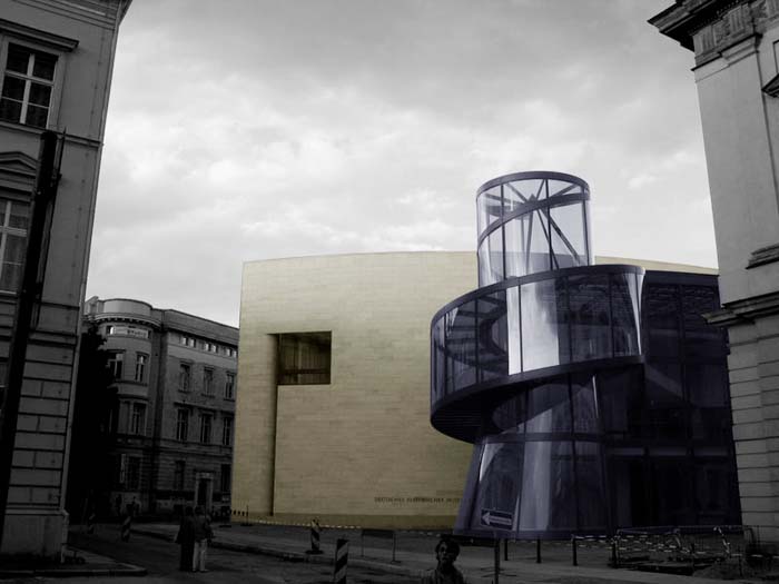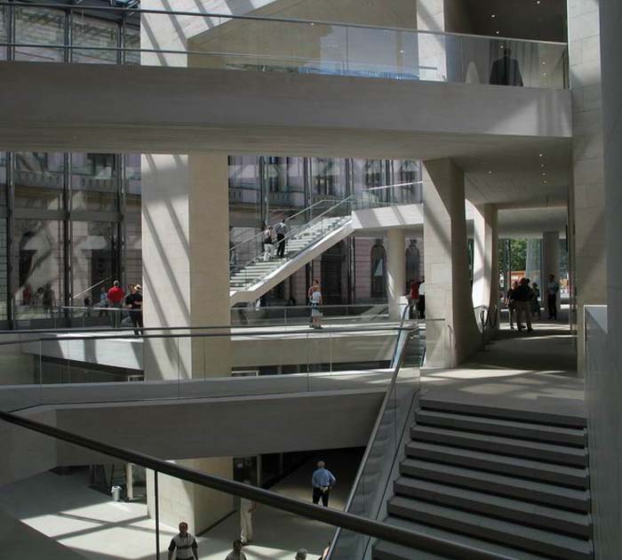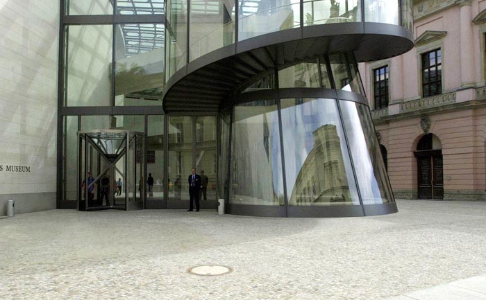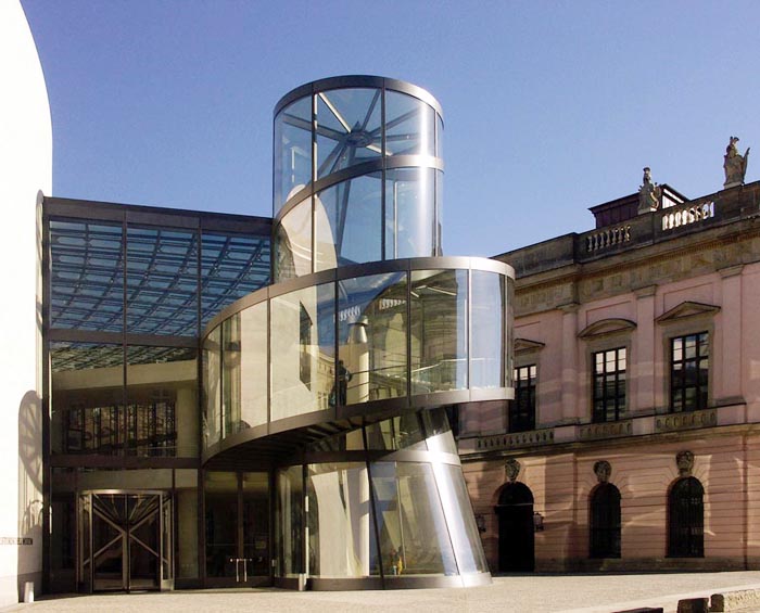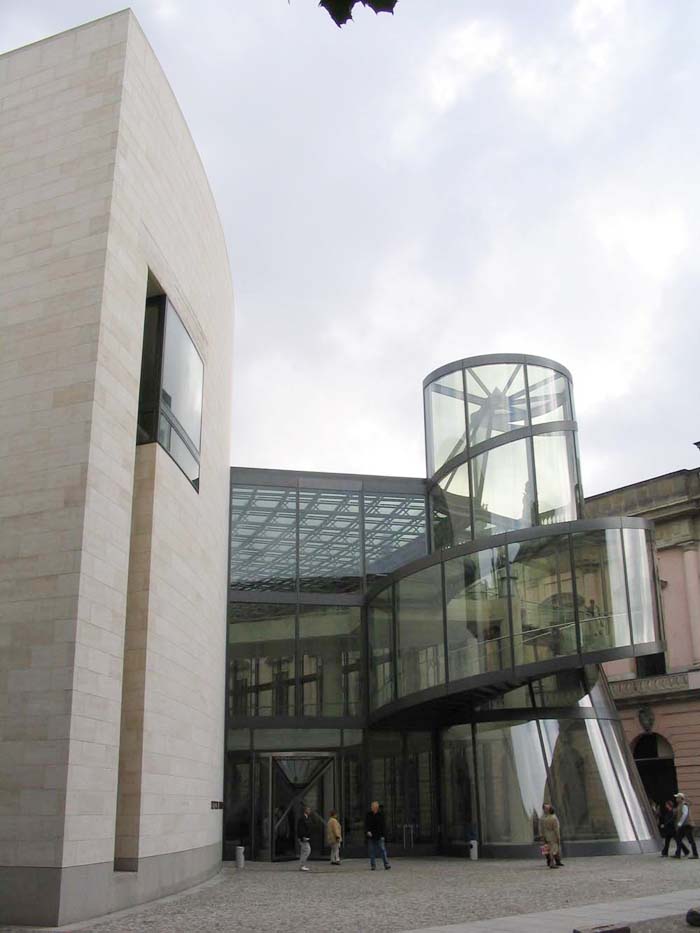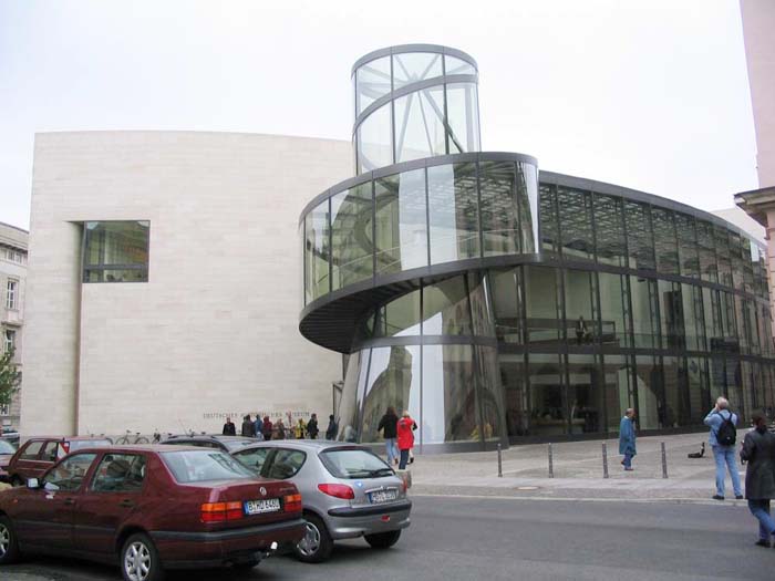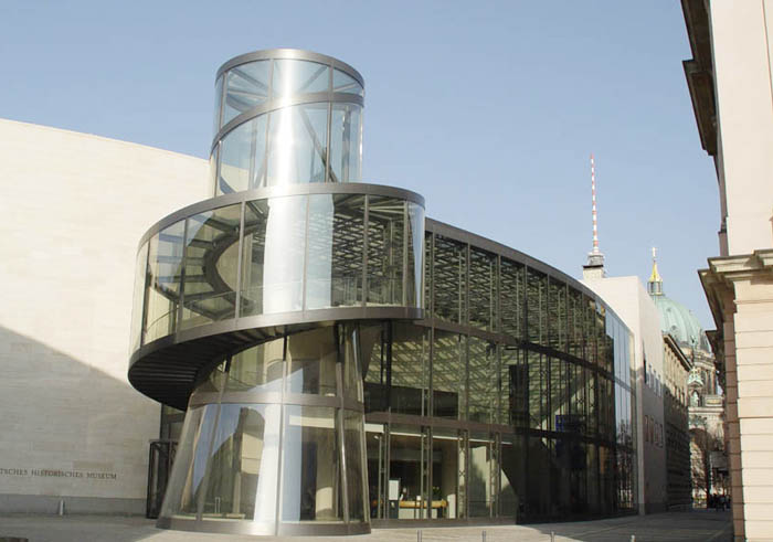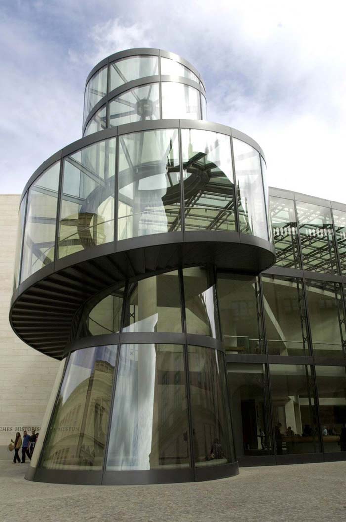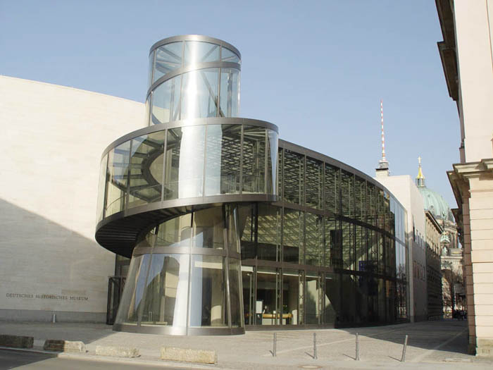 柏林上空的天似乎離德國歷史博物館新擴建的大樓特別近。螺旋式樓梯的玻璃中心柱蜿蜒在三個樓層之間,看上去就像是一個透明的蝸牛殼。在每一個樓層,走廊就像露臺一樣伸進雄偉的玻璃大廳,每一個玻璃大廳的圓頂以巨大的弧形凸出,在平時一般被遮擋住的大樓的整個邊上形成了拱形。一個巨大的玻璃柜,建筑學的展品,那是由玻璃、鋼筋與砂石組成的吸引觀眾的磁鐵--這就是德國第一個貝聿銘作品。