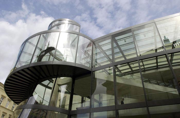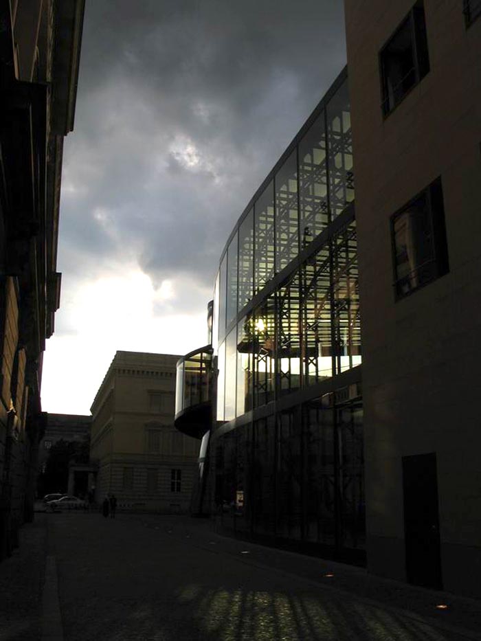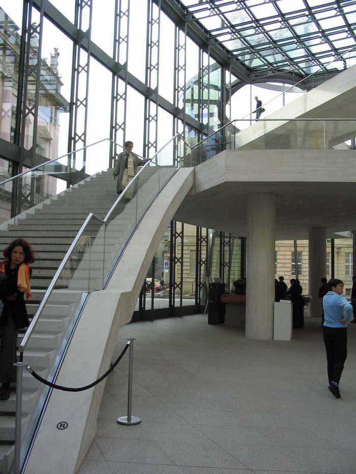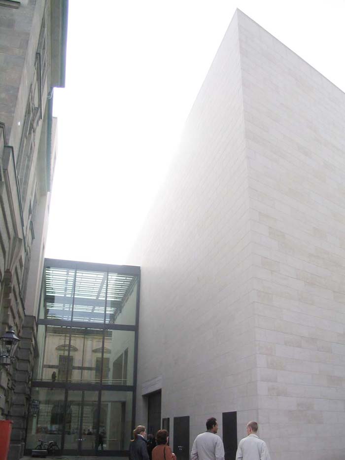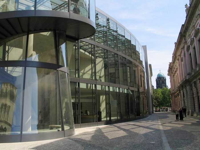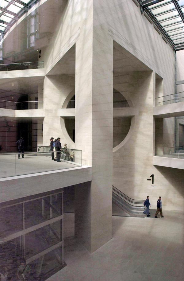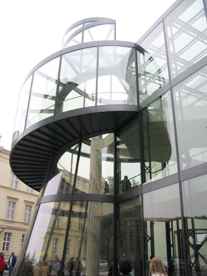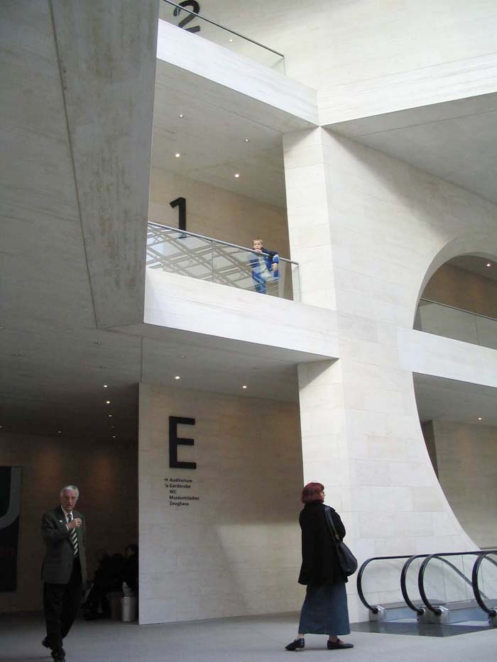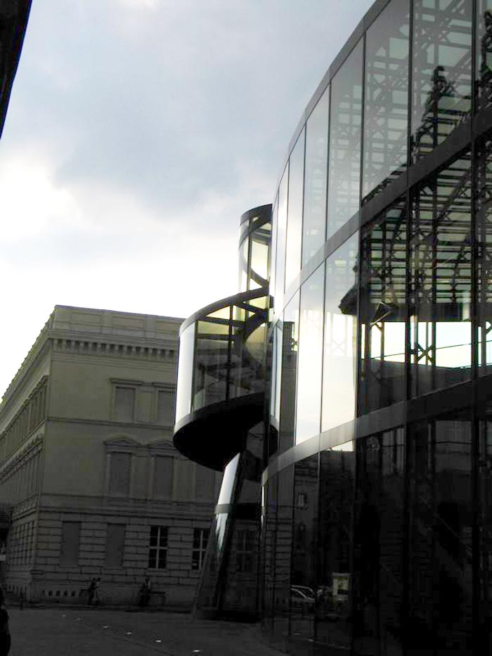 柏林上空的天似乎離德國歷史博物館新擴建的大樓特別近。螺旋式樓梯的玻璃中心柱蜿蜒在三個樓層之間,看上去就像是一個透明的蝸牛殼。在每一個樓層,走廊就像露臺一樣伸進雄偉的玻璃大廳,每一個玻璃大廳的圓頂以巨大的弧形凸出,在平時一般被遮擋住的大樓的整個邊上形成了拱形。一個巨大的玻璃柜,建筑學的展品,那是由玻璃、鋼筋與砂石組成的吸引觀眾的磁鐵--這就是德國第一個貝聿銘作品。