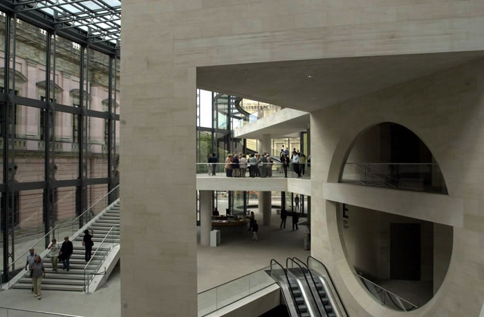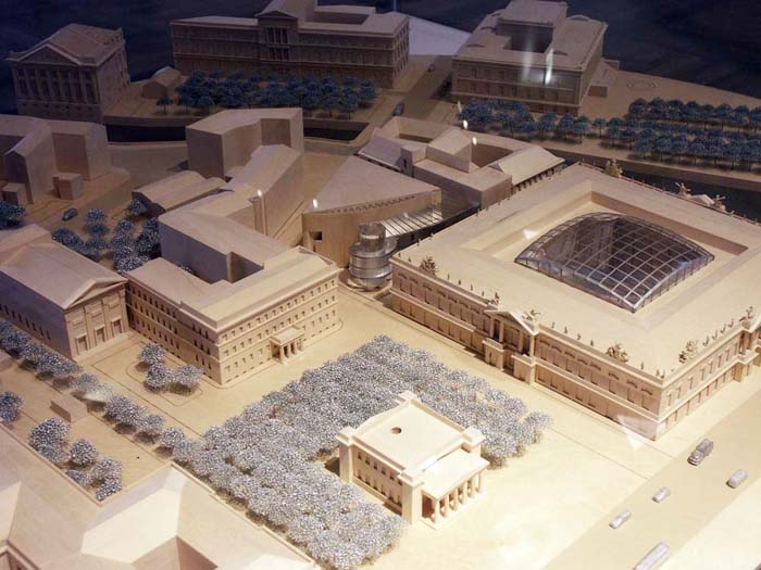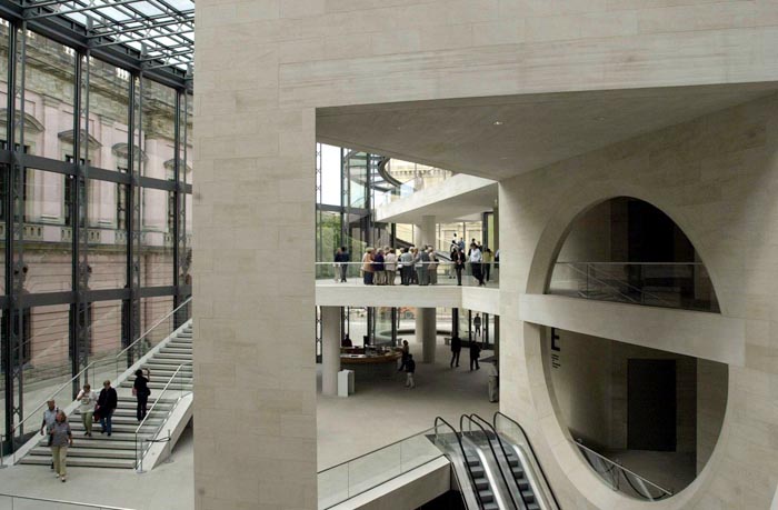 不過,軍械庫也是展示歷史與文化的地方。幾百年以來這里曾是軍火庫、英雄紀念館、納粹宣傳論壇。1952至1990年間,這里才成為博物館。這座1695年開始建造的建筑物上銘刻著巴洛克建筑師安德里亞斯·施呂特爾以及兩位1815年后被委派進行改建工作的普魯士古典主義大師申克爾與沙多的富有特色的手跡。要為擴建大樓尋找一種形式,這對貝聿銘來說是一個挑戰(zhàn):他面臨的挑戰(zhàn)是這幾位偉大藝術(shù)家的作品與一塊很小且位置很不利的地皮。這塊地皮在處于軍械庫陰影下的同時,又正好是在通往著名的博物館島的通道上。