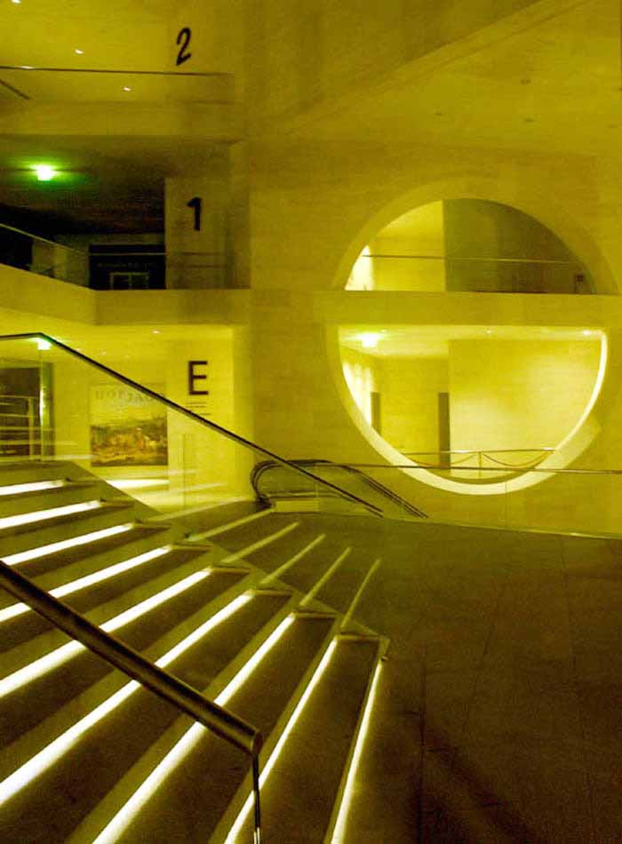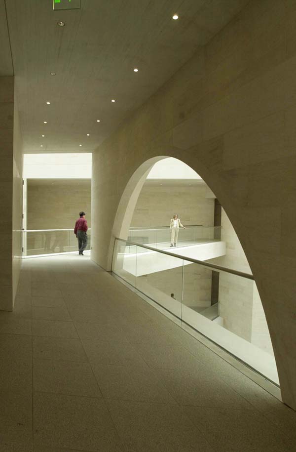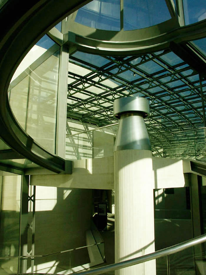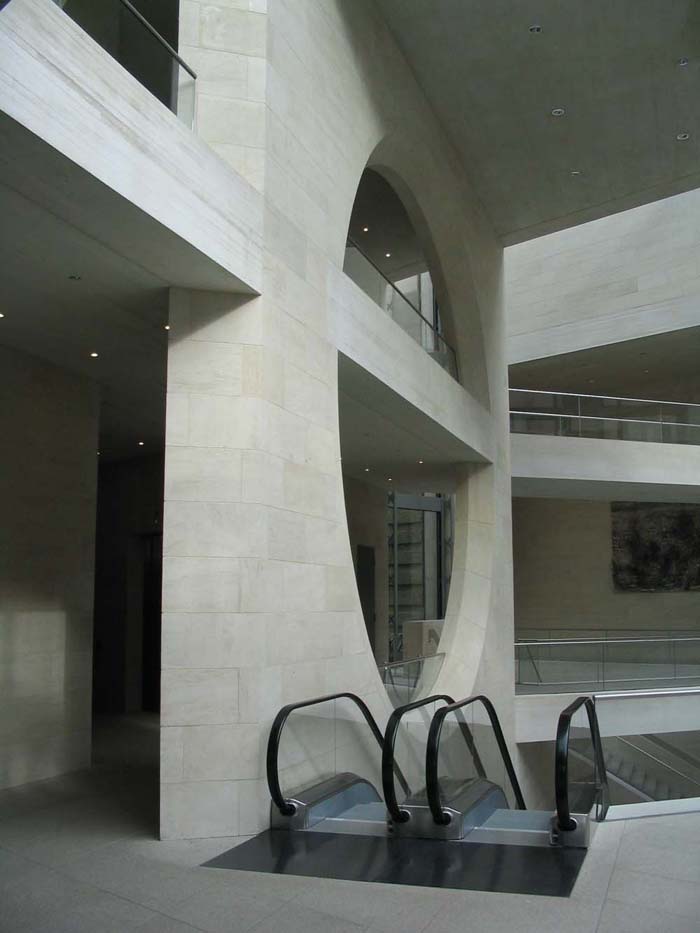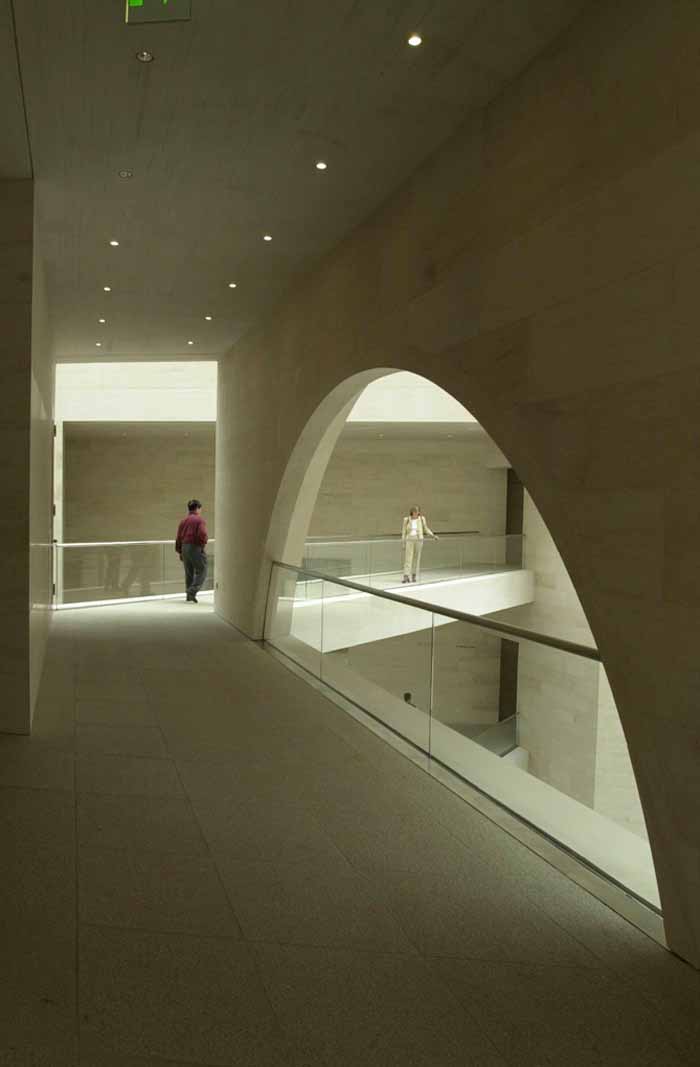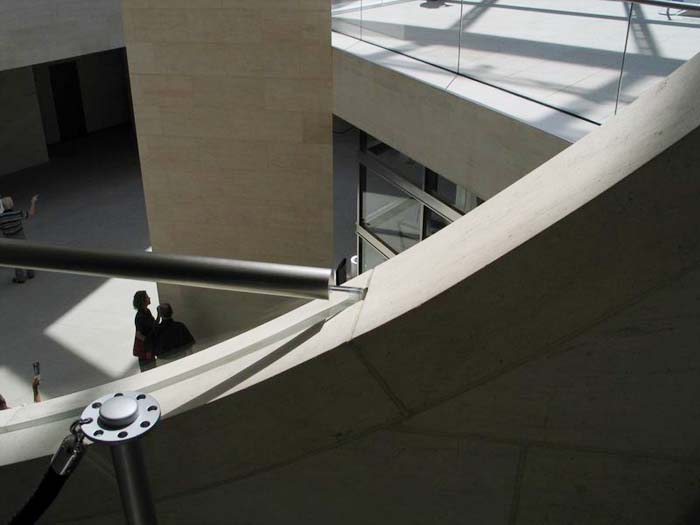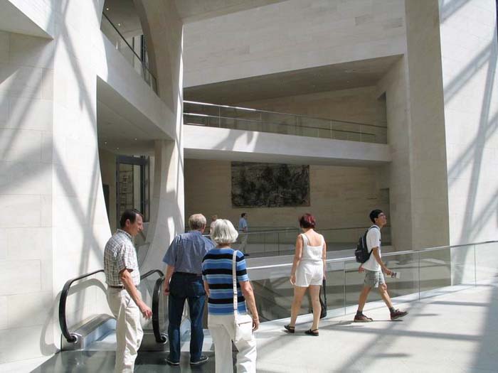貝聿銘以這個朝向軍械庫和弗里德利齊亞諾廣場的視線軸使新老建筑物之間在建筑藝術(shù)上取得了一致。由地下一層敞開的大空間可使視線不受阻地投向天空。這個極為寬敞的空間是貝聿銘根據(jù)對歷史建筑文物保護所作的規(guī)定而構(gòu)思出的完美方案。從自動扶梯,露天臺階,天橋或游廊人們總能將目光瞥向?qū)γ娴能娦祹炝⒚妗X愴层懛Q他的博物館建筑為“都市劇場”。從它的各個不同層面空間的交叉和垂直連接使得內(nèi)部空間在不同的角度出現(xiàn)各異的立體景象,不但極大地豐富了內(nèi)部的空域變化,也起到了同外部城市空間的關(guān)聯(lián)作用。