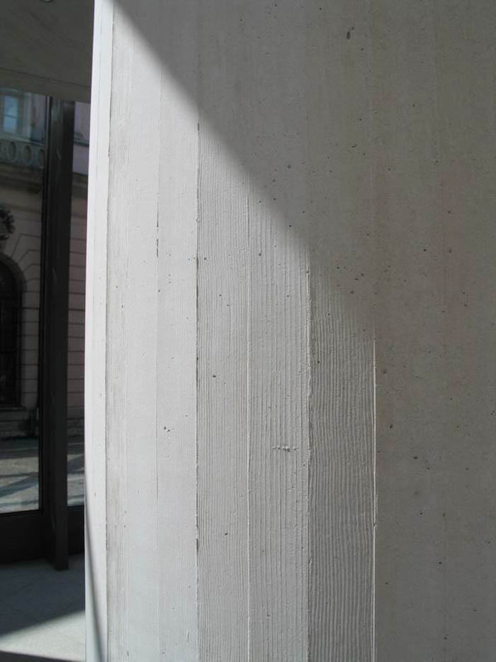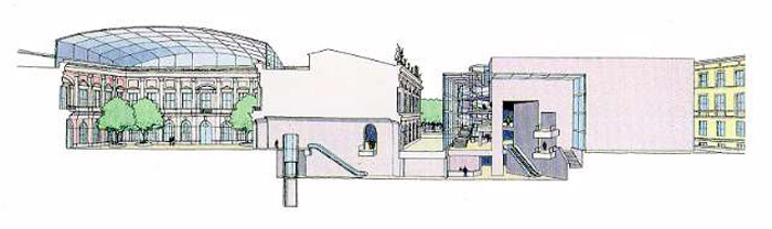[page]如果人們要問“一個大型的建筑意味什么?”,那么用貝聿銘的話回答便是“大型的建筑并不意味著是個大的挑戰(zhàn)?!钡拇_,這個夾在歷史老建筑物及其環(huán)境中間的基地狀況使得這個新館的設(shè)計成了對建筑師的很大挑戰(zhàn)。在這里,巴洛克建筑軍械庫在林登大街旁的弗里德利齊亞諾廣場上占居著主導地位。當年卡爾·弗里德利?!ば量擞麨樗O(shè)計的羅馬式紀念堂找到合適的位置可謂絞盡腦汁。為了保證他的建筑在受巴洛克建筑物很大影響的環(huán)境中同樣具有空間作用,他在紀念堂周圍按比例布置了一片七葉樹林。這片樹林起到了使紀念堂建筑新瓦赫同巴洛克建筑軍械庫之間保持間距和聯(lián)系的作用。但也使從林登大街投向新館基地的目光多了一層限制。此外巴洛克建筑同毗鄰的宮殿建筑挨得那么緊,以致于人們只能透過“縫隙”般的視域看到新館。按建筑師的設(shè)計語言來說,這意味著幾乎沒有視野地可利用來展現(xiàn)建筑體及其立面。尤其是新館北向的背面緊鄰著老建筑馬克希姆·戈基劇院。雖然從那兒人們可以將視線投向遠處博物館島上的弗里得利?!W古斯特·施蒂勒(Friedrich August Stueler)設(shè)計的老國家美術(shù)館,佩加蒙博物館,恩斯特·馮·伊內(nèi)(Ernst von Ihne)的博德博物館以及位于趣園旁辛克的老博物館,但可見的新館背立面也僅只能從側(cè)面觀其整個。然而此刻卻沒有任何其他建筑物能夠象新館建造將會對這個區(qū)域產(chǎn)生深遠的影響。因為這個城市空間的位置決定著德國歷史博物館越過施普雷支河與“文化的廣場”博物館島的無形聯(lián)系。
