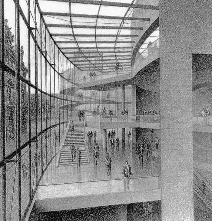 它要將巴洛克式的古典建筑風格同現(xiàn)代建筑風格相結(jié)合,從而表現(xiàn)出歷史與未來的結(jié)合。