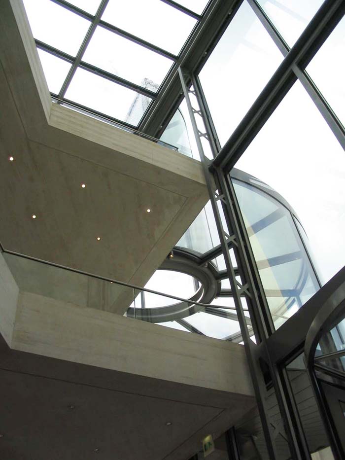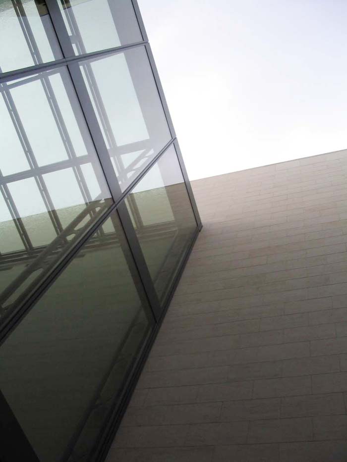貝聿銘以一個略帶弧形,幾乎與主體建筑等高的玻璃廊廳妥善地解決了同巴洛克建筑軍械庫之間距離上的沖突。這個玻璃廊廳使人們可以仰望天空。在地下層設(shè)有連接新老博物館的通道。天橋,廊臺,梁腹板,樓梯在不同的高度交叉連接,限定著廊廳的區(qū)域。在建造中廊廳采用了同巴黎盧浮宮金字塔一樣水晶般的最高品質(zhì)玻璃,從視覺上拓展了狹小場地的范圍。玻璃墻幕既分隔開兩幢建筑物,又使其相互關(guān)聯(lián)。博物館的參觀者在映現(xiàn)的巴洛克建筑富麗堂皇的背景下閑逛的同時,古老的建筑也隨之在“運動”。貝聿銘還在新館的入口處很有自我意識地對著巴洛克建筑和宮殿建筑的豁口設(shè)置一個玻璃的螺旋樓梯塔。在這個沒有回旋余地處聳立這么個“捕捉眼”可以說幾乎是唯一的可能,使新館在體形上有一個吸引點,將人們的注意力從軍械庫和新瓦赫的阻隔后面吸引過來。因為這樣的玻璃螺旋樓梯塔常被用在百貨商店或購物中心,所以也有批評者對此謹慎地提出了批評。事實上建筑美的創(chuàng)造不僅僅是建筑師突發(fā)奇想的結(jié)果,更主要的是根據(jù)其功能需要所作的安排。在剩下的建筑用地約近2000m2上貝聿銘設(shè)計了一個簡潔明了的三角形幾何體。各展覽大廳都分布在里面。三角幾何體是貝聿銘在建筑設(shè)計中經(jīng)常使用的基本形式,在他著名的建筑中都曾運用到。華盛頓國家美術(shù)館東館是兩個相互構(gòu)成個梯形的三角形;香港的中國銀行大廈是由一組排列和旋轉(zhuǎn)了三角體構(gòu)成;巴黎盧浮宮金字塔是由四個三角形在一個正方形上筑成的空間。