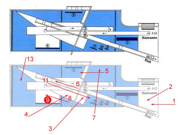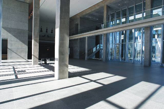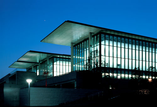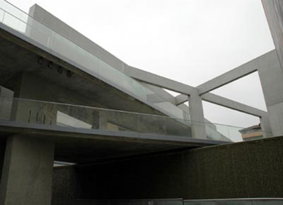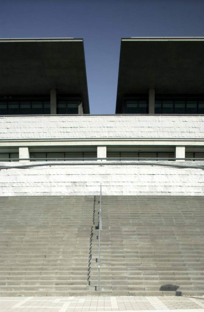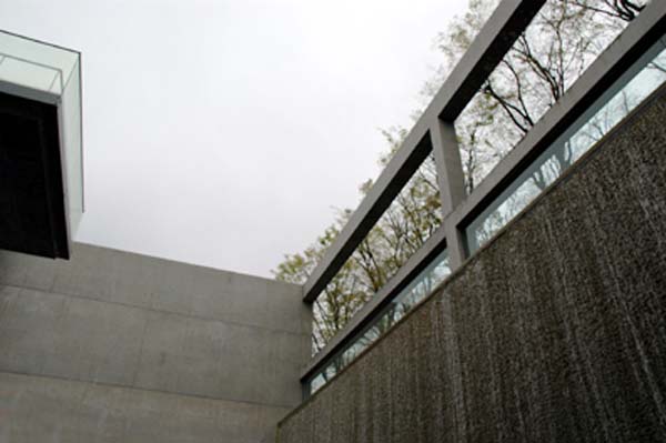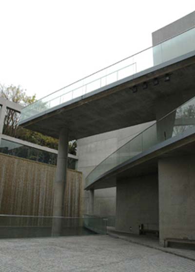 美術(shù)館收藏著蘭根夫婦收集的東洋美術(shù)和現(xiàn)代美術(shù)藏品。接受了這個項目之后,我考慮設(shè)計兩個不同性格的空間。一個是為東洋美術(shù)而做的、充滿柔和光線的“靜”的空間。另一個則是為現(xiàn)代美術(shù)而作的光影交織跳動的“動”的空間。反復(fù)研究之后,我們使建筑群的構(gòu)成包括了采用混凝土箱形外包玻璃皮膜的雙層膜構(gòu)造的東洋美術(shù)常設(shè)展示廳,以及與之成45度角建筑一半埋入地下的并列的兩棟特別展示廳。