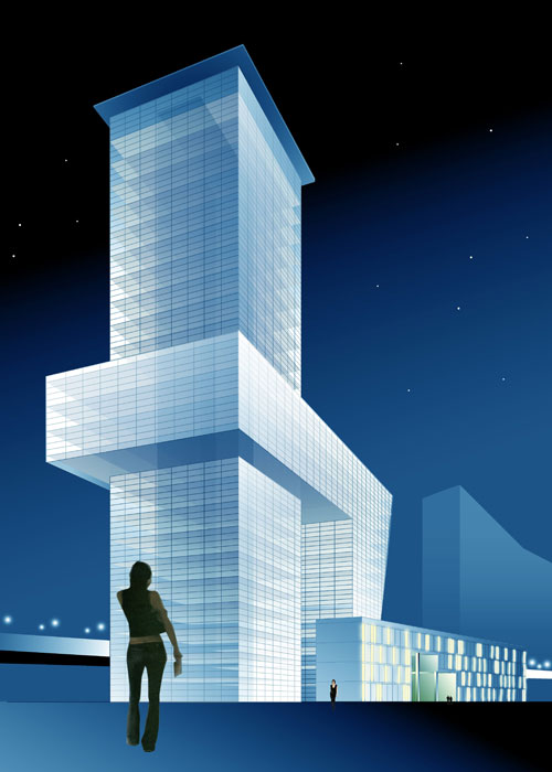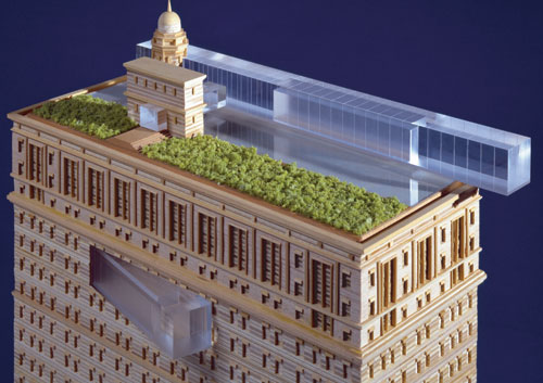 閣樓是建筑物最上層的箱型建筑,用混凝土建造,外包玻璃表皮,如懸浮于空中一般。在距離最上層五層樓的地方,也使用同樣素材與形態(tài)的箱型體,以偏斜的角度貫穿嵌入到左右對稱的高層建筑中。另外,考慮在屋頂上設(shè)置大片水池,使曼哈頓摩天樓浮現(xiàn)其上,從而演繹驚人的“借景”手法。