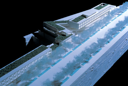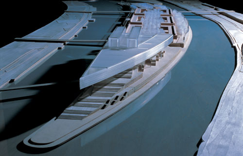 這是2001年10月,我們?yōu)閰⒓訃H建筑設(shè)計競賽而做的位于巴黎的新美術(shù)館方案。地點在巴黎西南郊外塞納河的塞岡島上?;孛娣e3.2公頃,總建筑面積60,000平方米,是歐洲民間最大規(guī)模的建筑設(shè)計,備受矚目,堪稱“蓬皮杜中心第二”。塞岡島是法國汽車制造商雷諾的發(fā)祥地,同時又是1968年巴黎五月革命崛起的地方,因此它對巴黎及巴黎市民而言,具有相當重大的意義。