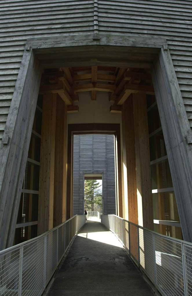 常設(shè)展示棟“靜”的空間,采用混凝土和玻璃的鑲嵌構(gòu)造,導(dǎo)入了日本傳統(tǒng)建筑手法“緣側(cè)”般的緩沖空間領(lǐng)域。讓人感覺身在美術(shù)館內(nèi)部卻像漫步森林中一樣,建筑的內(nèi)外空間具有流動性。