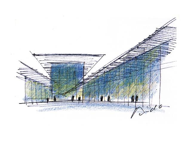 對于“在再開發(fā)地區(qū)創(chuàng)造一個嶄新的信息發(fā)散基地”這一主題,我們試圖摸索一種建筑形態(tài),使它對外成為新的街區(qū)景觀核心,對內(nèi)則與創(chuàng)造原點相符合,成為一個具有深度和廣度的空間形態(tài)。