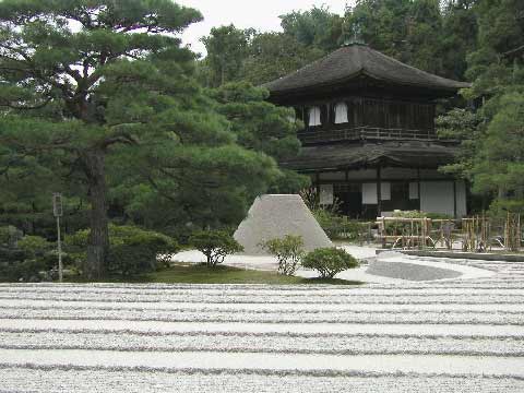 15世紀建于京都龍安寺的枯山水庭園是日本最有名的園林精品。它占地呈矩形,面積僅330平方米,庭園地形平坦,由15尊大小不一之石及大片灰色細卵石鋪地所構成。石以二、三或五為一組,共分五組,石組以苔鑲邊,往外即是耙制而成的同心波紋。同心波紋可喻雨水濺落池中或魚兒出水??词前咨啊⒕G苔、褐石,但三者均非純色,從此物的色系深淺變化中可找到與彼物的交相調(diào)諧之處。而砂石的細小與主石的粗獷、植物的“軟”與石的“硬”、臥石與立石的不同形態(tài)等,又往往于對比中顯其呼應。因其屬眺望園,故除耙制細石之人以外,無人可以邁進此園。而各方游客則會坐在庭園邊的深色走廊上——有時會滯留數(shù)小時,以在砂、石的形式之外思索龍安寺布道者的深刻涵義。