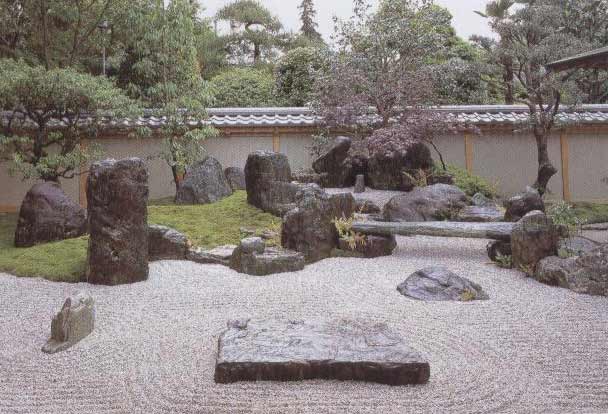 枯山水庭園是源于日本本土的縮微式園林景觀,多見于小巧、靜謐、深邃的禪宗寺院。在其特有的環(huán)境氣氛中,細細耙制的白砂石鋪地、疊放有致的幾尊石組,就能對人的心境產(chǎn)生神奇的力量。它同音樂、繪畫、文學一樣,可表達深沉的哲理,而其中的許多理念便來自禪宗道義,這也與古代大陸文化的傳入息息相關。