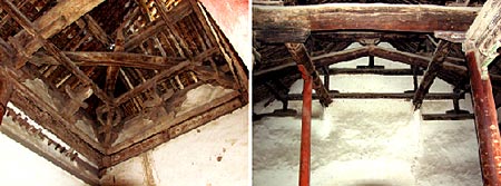 盧宅位于浙江東陽縣城東門外,建于明景泰七年(1456年)至天順六年(1462年),其后又不斷修建而成一區(qū)規(guī)模龐大的住宅群體。全宅占地約5公頃,由十余組按南北軸線布置的宅院所組成。主軸線沿照壁穿過三座石牌坊轉折至肅雍堂、樂壽堂而止于世雍堂。住宅周圍有河流環(huán)繞,通過跨河的九座橋梁而溝通宅內外聯(lián)系。宅前大道西通東陽城東門。從門前眾多牌坊可知,這是一處世代為官的家庭聚居地。肅雍堂是全宅的主廳,其布局和曲阜衍圣公府相似,前有門屋兩重,堂前兩側設東、西廂。肅雍堂平面作工字形,以穿堂將前后二堂聯(lián)結成一體。其中前廳原是歇山屋頂,后雖改為兩廈懸山頂,但室內木構架仍保留歇山轉角做法,斗拱式樣也很華麗。按明制規(guī)定,品官住宅不準用歇山頂,因此肅雍堂前廳的屋頂改形是否系宅主為逃避“逾制”之罪而采取的補救措施?這種現(xiàn)象在明代住宅中甚為罕見。