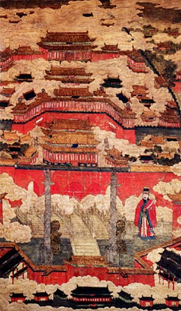 道教建筑在元明時期也有所發(fā)展?,F(xiàn)存建于元代的山西省芮城縣永樂宮是道教建筑的重要遺例,宮中龍虎殿、三清殿、純陽殿、重陽殿中的大面積壁畫,精美絕倫,在中國繪畫史上占有重要地位。明代的道教建筑則以永樂皇帝在湖北武當山所建的道教宮觀群最為宏偉。