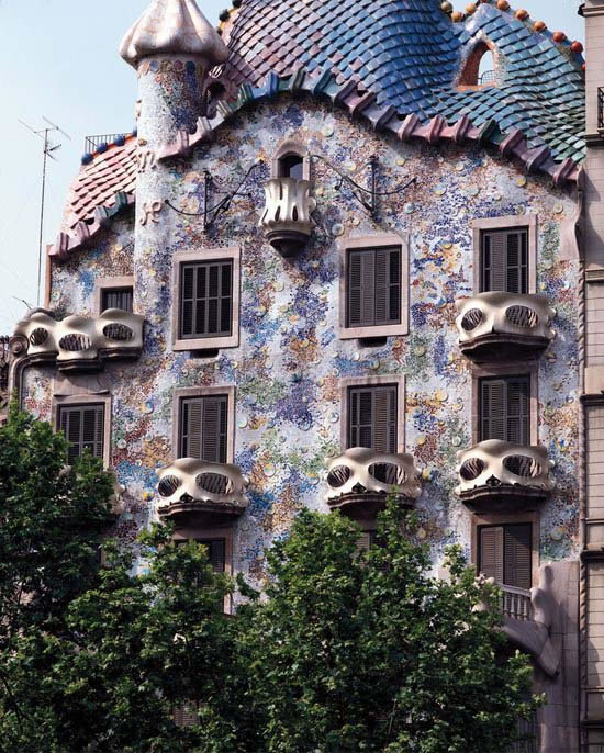 巴特略之家和米拉之家是高迪實(shí)踐自然理論的代表作。前者采用小塊彩色陶瓷及玻璃做成有機(jī)造型,在加泰羅尼亞地區(qū)流傳的“喬治屠龍救公主”的故事是建筑設(shè)計(jì)靈感的來(lái)源。這座充滿神秘氣氛的房子,在晚上觀看更為奇妙,高迪自己激動(dòng)地稱它“看起來(lái)像是一座天堂的房子”。米拉之家“酷似斷崖的外觀,內(nèi)外連續(xù)性的建造方式被喻為‘迷宮’的寫照”。其連續(xù)性的彎曲造型,像海浪起伏具有動(dòng)感,立面大窗一個(gè)洞一個(gè)洞猶如蜂窩,也讓人覺得這房子是被海浪侵蝕后的巖石。