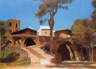 古埃爾教堂是古埃爾領(lǐng)地中畫龍點(diǎn)睛的建筑,古埃爾特意委托高迪設(shè)計(jì),從1890年開始設(shè)計(jì),1908年才動(dòng)工興建,至1916年教堂僅僅完成地下部分和上部入口門廊及部分鐘塔后就終止了。古埃爾教堂位于一個(gè)土丘上,四面是松林,半地下教堂的后部是擋土墻,通往半地下教堂的門廊同時(shí)支撐著通往上部教堂的臺(tái)階,導(dǎo)向性很鮮明。高迪在設(shè)計(jì)初期先用繩索做了一個(gè)有名的倒置模型進(jìn)行靜力分析,研究頂板磚拱結(jié)構(gòu)和室內(nèi)裝飾效果。半地下教堂的柱子是用質(zhì)感粗糙的耐火磚和石塊砌筑,正廳中間的四根大柱子是整體石料以加強(qiáng)表現(xiàn)力。因?yàn)樯蠈尤杂薪烫?,故而半地下教堂的頂板采用平緩的磚拱支在鋼架上,相互交織的磚拱組成了一幅美麗的圖案。從入口門廊到室內(nèi)裝修細(xì)部都摹擬自然界的生態(tài),突出建筑材料原有的質(zhì)感,高迪認(rèn)為表達(dá)教堂的高貴品質(zhì)應(yīng)當(dāng)是真實(shí)的美,而自然的美才是真實(shí)的。這種摹擬自然的客觀效果為教堂增添了幾分神秘色彩。
