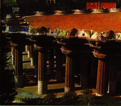 高迪把這一大片山地劃分成十幾塊單獨(dú)的地塊并用大圓石作了標(biāo)記,接著浩大的建筑工程就開工了。正是在古埃爾公園這里,高迪成功地將大自然與建筑有機(jī)地結(jié)合成一個(gè)完美的整體。這里的一切——小橋、道路和鑲嵌著彩色瓷片的長(zhǎng)椅,都蜿蜒曲折,好像漂蕩流動(dòng)著似的,構(gòu)成詩(shī)一般的意境。按建筑師的意圖將成為未來(lái)居民休憩場(chǎng)所的中央廣場(chǎng),建有柱廊,但其中的柱子沒(méi)有一根是筆直的,全像天然森林中的樹干。