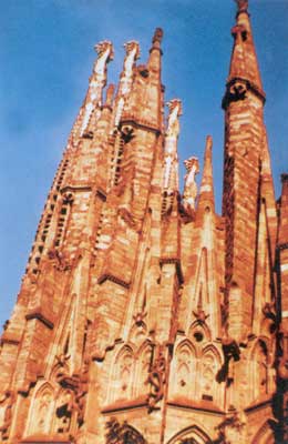 170米的高塔、五顏六色的馬賽克裝飾、螺旋形的樓梯、宛如從墻上生長(zhǎng)出來(lái)的栩栩如生的雕像……,龐大的建筑顯得十分輕巧,有如孩子們?cè)诤┥显炱饋?lái)的沙雕城堡。不過(guò)教堂顯得有些令人恐怖,難怪有的民眾稱之為“石頭構(gòu)筑的夢(mèng)魘”。