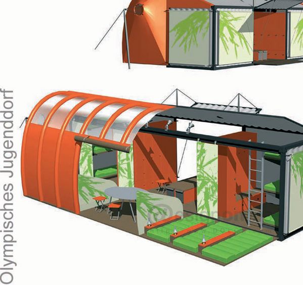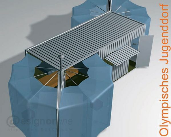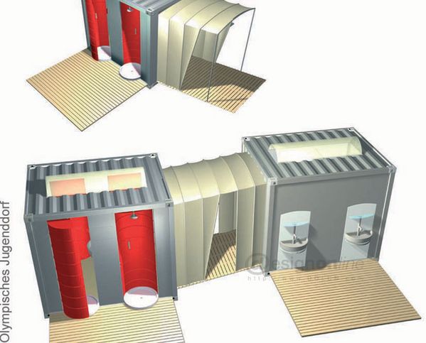 奧林匹克青年村,要在短時(shí)間內(nèi)為來(lái)自世界各地參加盛會(huì)的年輕人提供一個(gè)生活,住宿,相互交流的場(chǎng)所及設(shè)施,同時(shí)在奧運(yùn)會(huì)結(jié)束后又要考慮這些設(shè)施的拆裝以及二次利用,由此課題的設(shè)計(jì)方向確定為對(duì)于臨時(shí)性住宅的研究。針對(duì)這一特性,齊墨教授將課題展開(kāi)的基本元素定為標(biāo)準(zhǔn)尺寸的海運(yùn)集裝箱,以這些元素來(lái)展開(kāi)系列設(shè)計(jì)方案。包括住宿空間,衛(wèi)浴空間,以及餐飲空間等等。