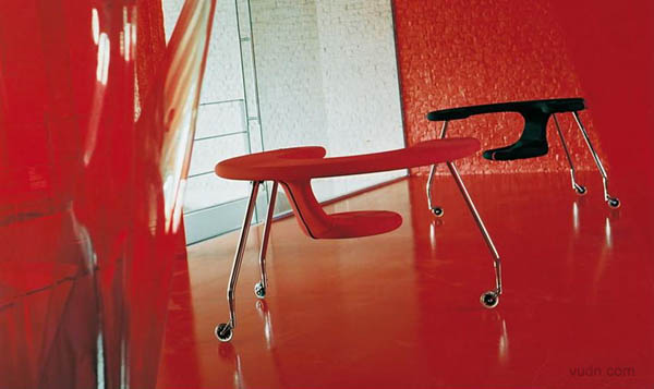 專為Bulo設(shè)計(jì)。扶手椅的腿下有可移動(dòng)的輪子,靠背和扶手還可以當(dāng)作書桌使用。是酒店前廳,會(huì)議中心和各種辦公機(jī)構(gòu)的理想用具。