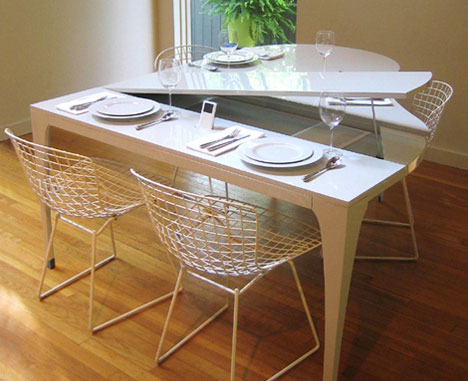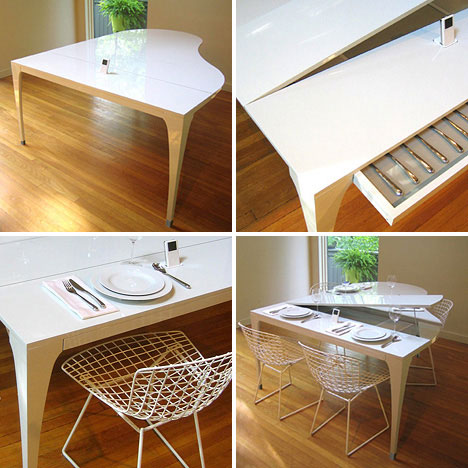 這架長得像鋼琴的餐桌,沒有琴鍵,顯然是不能彈奏了,但是它也不是啞巴,設(shè)計(jì)者在桌面上預(yù)留了一個(gè)iPod Dock,晚餐需要音樂助興的時(shí)候,只要把iPod插上,再掀開假冒的鋼琴蓋子,就能通過內(nèi)置的揚(yáng)聲器來播放音樂了. 其實(shí),這樣看起來很優(yōu)雅美妙的桌子放在書房里作為工作臺(tái)應(yīng)該也是蠻不錯(cuò)的選擇