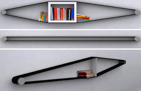 這個(gè)獨(dú)特的書架由一圈彈性繃帶和兩個(gè)固定在墻上的金屬桿組成. 基于那條繃帶的高彈性,你可以放置任何形狀的東西進(jìn)去,當(dāng)然別太出格的情況下…不過值得我們擔(dān)心的是,為了要讓這繃帶繃緊,不至于讓書本什么的墜到地上去,那就需要繃帶有超強(qiáng)的彈力并且足夠緊繃. 這勢必會(huì)帶來一些危險(xiǎn)性,比如繃帶脫落、或者緣于意外的突然斷裂等等,說不準(zhǔn)都會(huì)傷人.