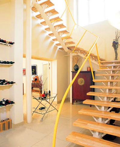 [page]設(shè)計獨到的樓梯不僅實用,更是一個靈動的雕塑作品。家中開Party時,總有客人喜歡將自己也融到作品中,信手將紅酒放在樓梯上,不時小飲一口。
