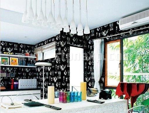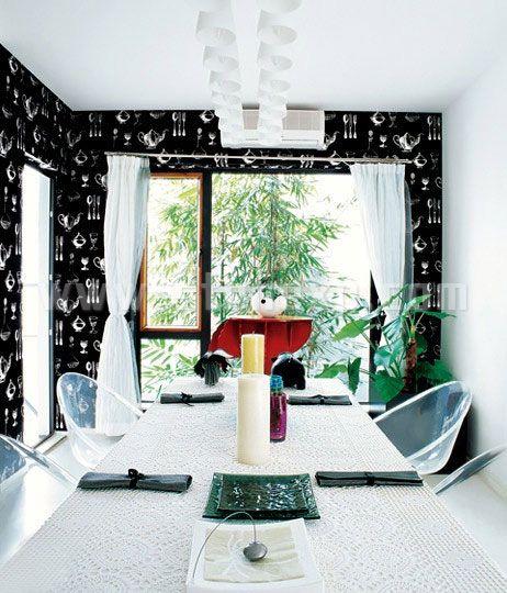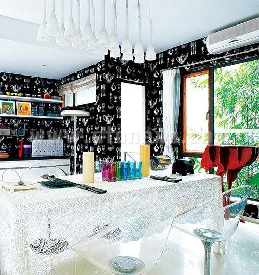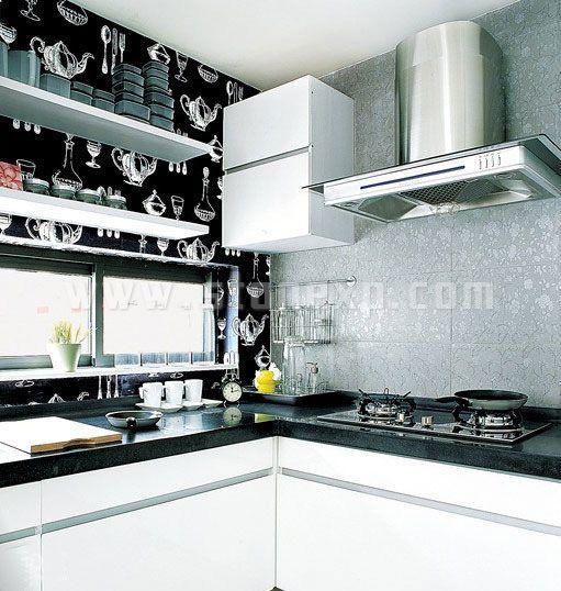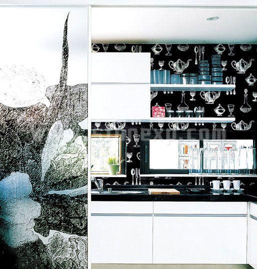 在黑與白的空間中,工業(yè)設(shè)計(jì)的廚具和灶具,表現(xiàn)出現(xiàn)代家庭的極簡(jiǎn)生活理念,同時(shí),在出軌上擺放一些可愛的調(diào)料瓶、餐具,可愛感也可以非常突出地表現(xiàn)出來。在操作臺(tái)的黑白色調(diào)對(duì)比之下,銀灰色古典主義的墻紙為廚房增添一種不凡的超脫,成為精致生活的絕佳代表。