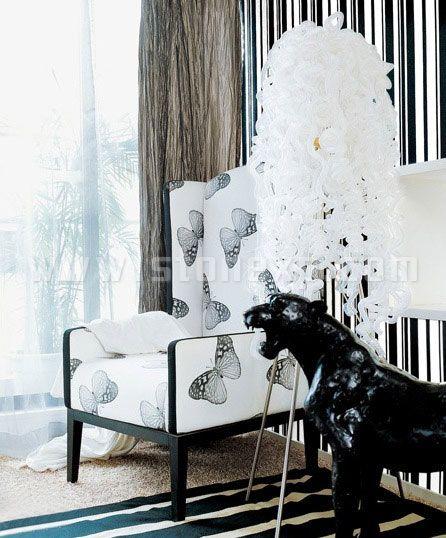 白色的蝴蝶圖案單人座椅為臥室里的休閑空間帶來了纖柔的優(yōu)雅感,再配以夢(mèng)幻感的發(fā)絲造型燈和充滿野性的仿真雕塑,臥室的休閑區(qū)便具有了貴族的氣質(zhì)。