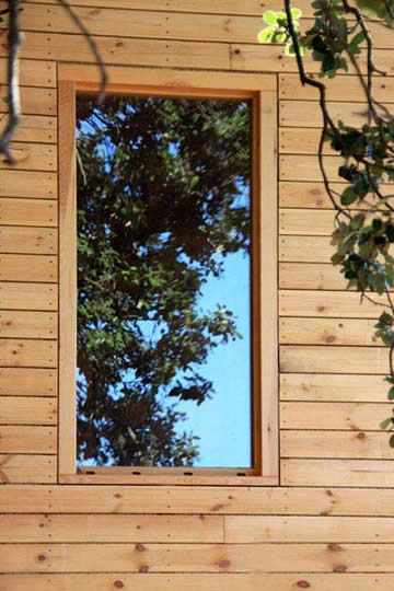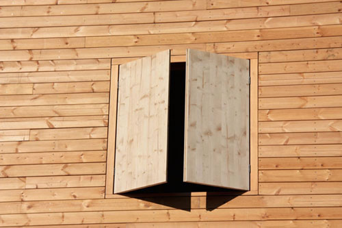 房子外立面由于采用了針葉松木,因此具有很好的通風(fēng)效果,而且窗口處還安裝了收縮式遮陽棚。