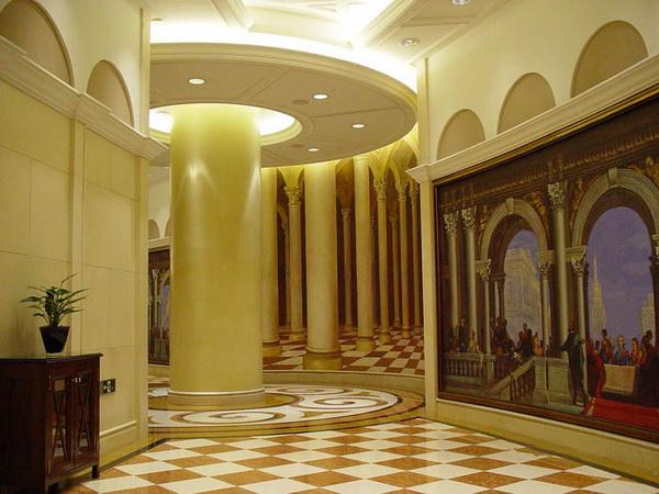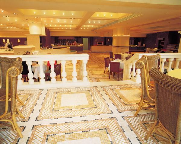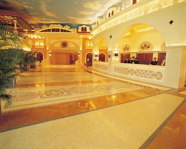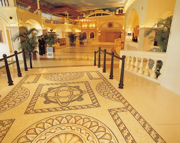 石材馬賽克工藝和石材水刀拼花相互關聯(lián)的,甚至于在國外,石材水刀拼花還是屬于石材馬賽克工藝的范疇。在這里,威尼斯酒店的墻面和地面便是一個典型的例子可以說明。這里的墻面和地面由小顆粒馬賽克來裝飾,因為小顆粒馬賽克有著靈活的調(diào)整和重組優(yōu)勢,可用于有界面區(qū)分的平面類的效果隔斷或者收邊部分,它的整體拼圖裝修效果遠遠勝于光面石材拼花。